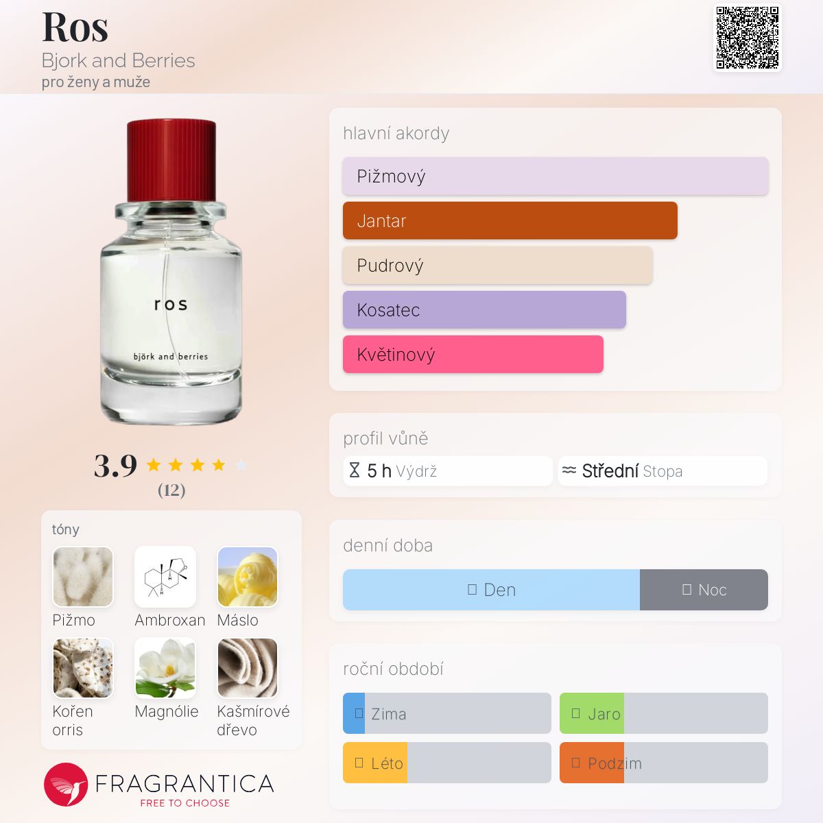Ros podle Bjork and Berries je Floral vůně pro ženy a muže. Toto je nová vůně. Ros byl/a uveden/a v roce 2024. Vrchní tóny jsou Magnólie, Růžová frézie a Levandule; střední tón jePižmo ; základní tóny jsou Ambroxan, Máslo, Orris a Kašmírové dřevo.