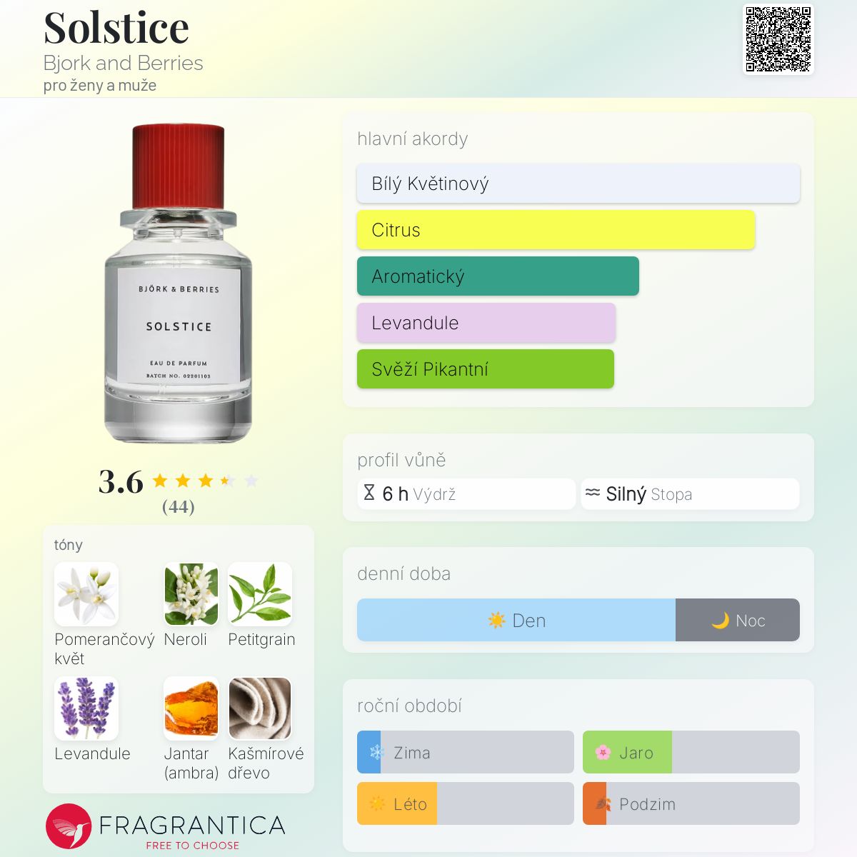 Solstice podle Bjork and Berries je Orientální Floral vůně pro ženy a muže. Solstice byl/a uveden/a v roce 2017. Vrchní tóny jsou Neroli a Petitgrain; střední tóny jsouPomerančový květ a Levandule ; základní tóny jsou Bílý jantar (ambra) a Kašmírové dřevo.