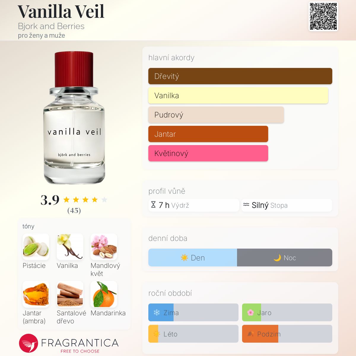 Vanilla Veil podle Bjork and Berries je Orientální Vanilla vůně pro ženy a muže. Toto je nová vůně. Vanilla Veil byl/a uveden/a v roce 2025. Vrchní tóny jsou Pistácie a Mandarinka; střední tóny jsouMandlový květ , Jantar (ambra) a Mimóza ; základní tóny jsou Vanilka, Santalové dřevo a Pačuli.