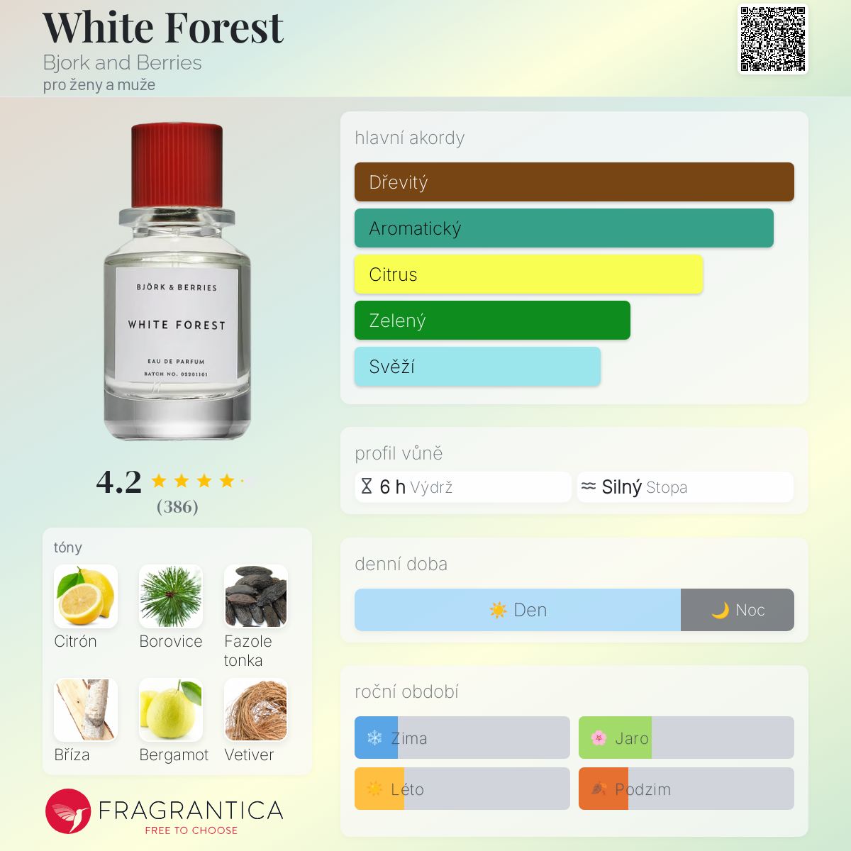 White Forest podle Bjork and Berries je Floral Woody Musk vůně pro ženy a muže. White Forest byl/a uveden/a v roce 2016. "Nosem" za touto vůní je Jérôme Epinette. Vrchní tóny jsou Citrón, Bergamot a Černý rybíz; střední tóny jsouFialka a Konvalinka ; základní tóny jsou Borovice, Fazole tonka, Bříza, Vetiver a Cedr.