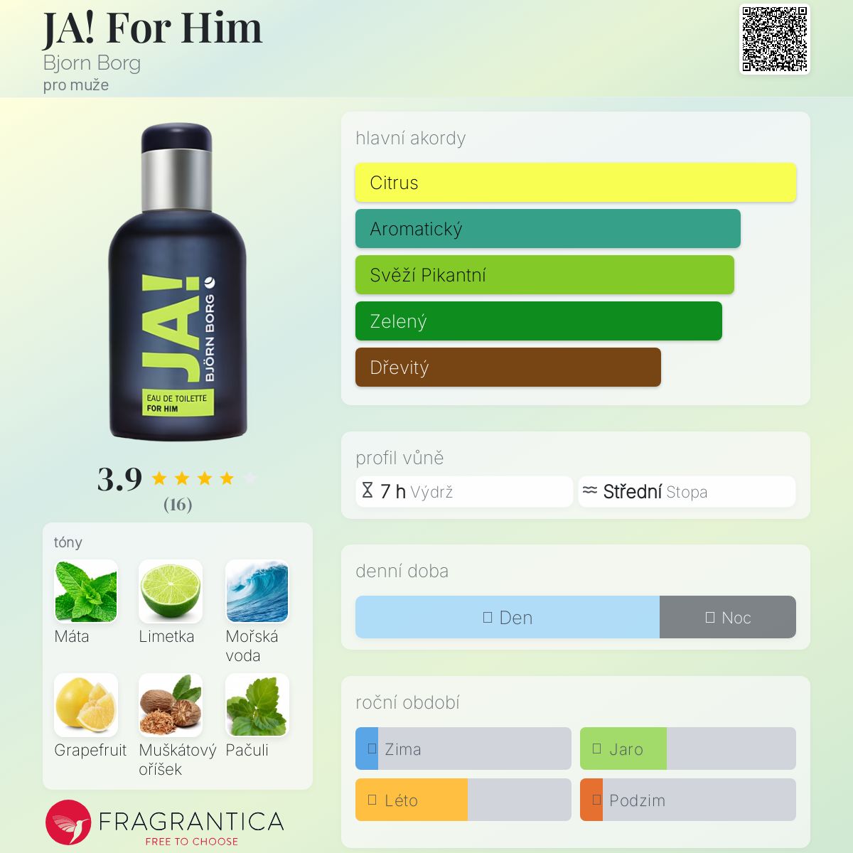 JA! For Him podle Bjorn Borg je Woody Aquatic vůně pro muže. JA! For Him byl/a uveden/a v roce 2013. Vrchní tóny jsou Limetka, Grapefruit a Mandarinka; střední tóny jsouMáta, Mořské tóny a Muškátový oříšek ; základní tóny jsou Pačuli, Dubový mech, Cedr a Pižmo.