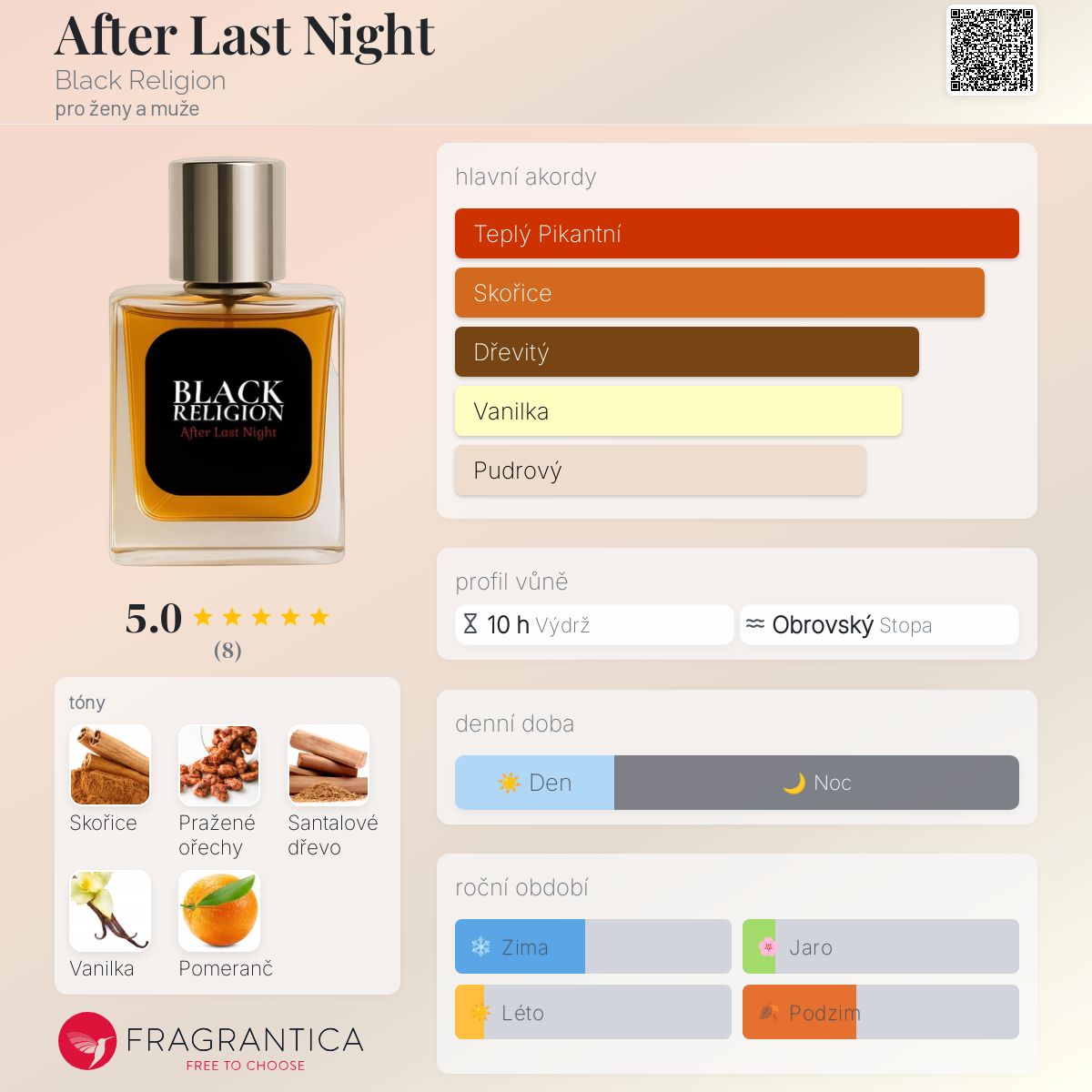 After Last Night podle Black Religion je Orientální Vanilla vůně pro ženy a muže. Toto je nová vůně. After Last Night byl/a uveden/a v roce 2025. "Nosem" za touto vůní je Máté Benicsák. Vrchní tóny jsou Pražené ořechy a Pomeranč; střední tón jeSkořice ; základní tóny jsou Santalové dřevo a Vanilka.