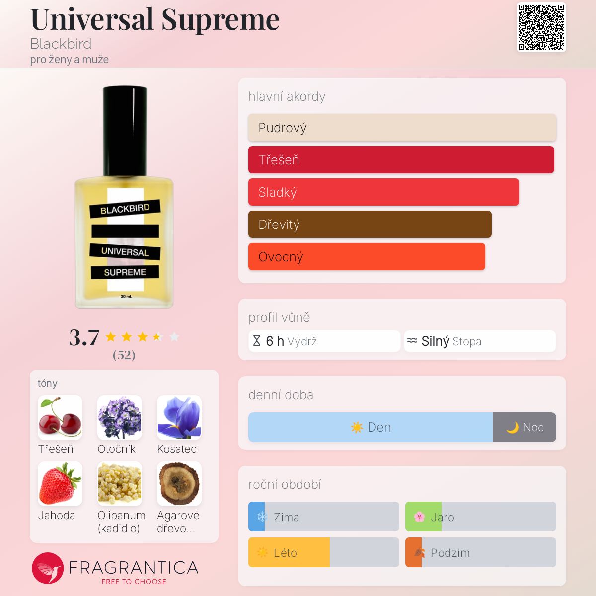 Universal Supreme podle Blackbird je vůně pro ženy a muže. Universal Supreme byl/a uveden/a v roce 2019. "Nosem" za touto vůní je Nicole Miller. Vrchní tóny jsou Třešeň a Jahoda; střední tóny jsouOtočník, Kosatec, Cedr, Seno a Růže ; základní tóny jsou Olibanum, Agarové dřevo (oud) a Santalové dřevo.
