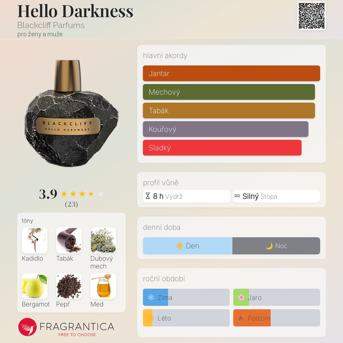 Hello Darkness podle Blackcliff Parfums je Orientální Floral vůně pro ženy a muže. Hello Darkness byl/a uveden/a v roce 2023. "Nosem" za touto vůní je Kyle Mott-Kannenberg. Vrchní tóny jsou Bergamot, Černý pepř, Růže a Levandule; střední tóny jsouTabák, Med, Jasmín a Mořské tóny ; základní tóny jsou Kadidlo, Dubový mech, Včelí vosk, Fazole tonka a Labdanum.