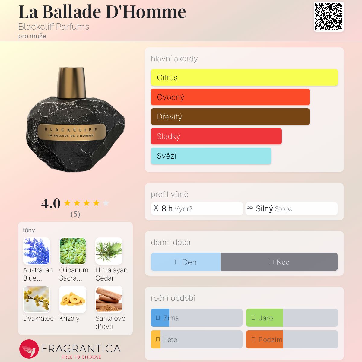 La Ballade D'Homme podle Blackcliff Parfums je Woody vůně pro muže. Toto je nová vůně. La Ballade D'Homme byl/a uveden/a v roce 2024. "Nosem" za touto vůní je Kyle Mott-Kannenberg.