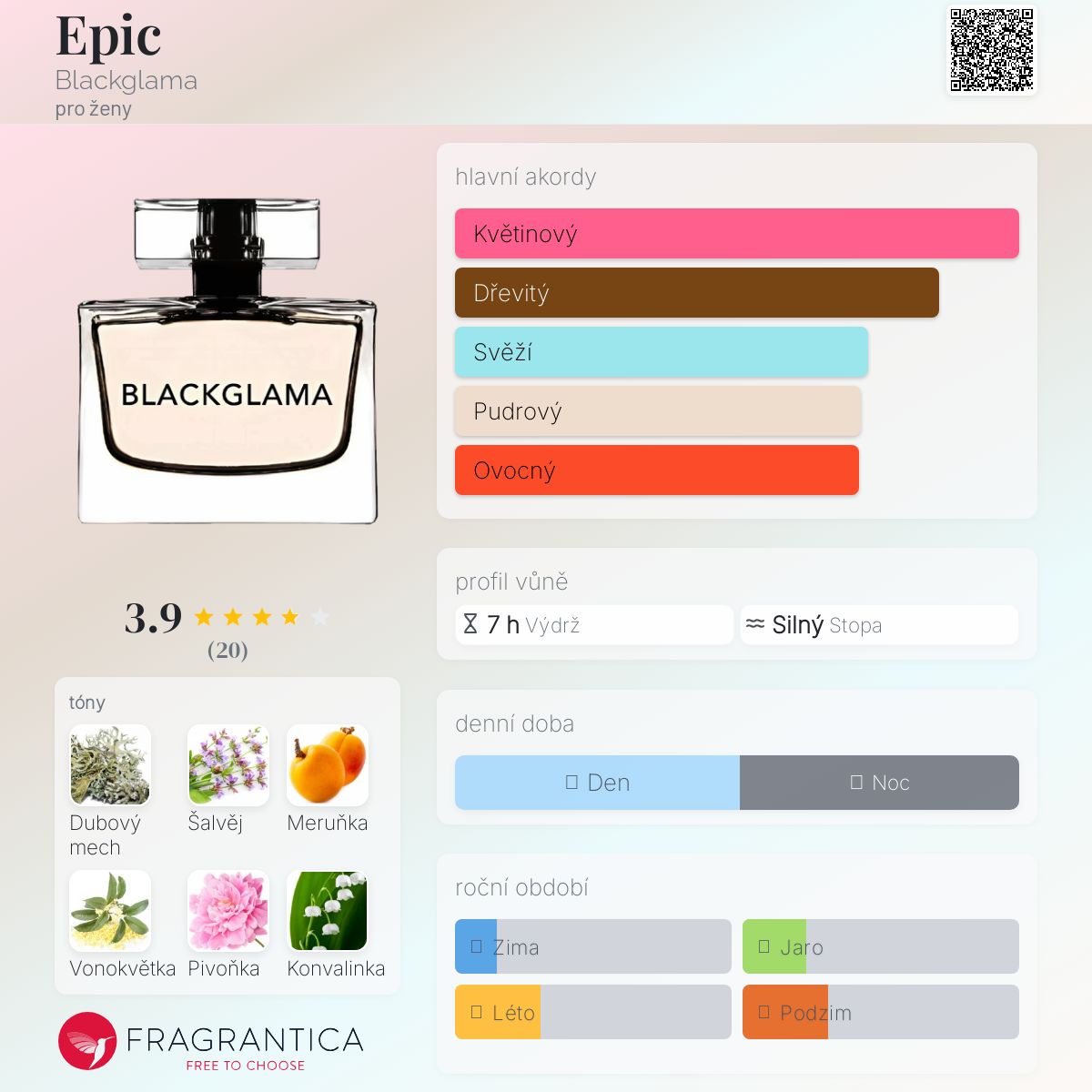 Epic podle Blackglama je Orientální Floral vůně pro ženy. Epic byl/a uveden/a v roce 2013. "Nosem" za touto vůní je Vincent Kuczinski. Vrchní tóny jsou Šalvěj, Meruňka, Ylang-Ylang a Bergamot; střední tóny jsouVonokvětka, Pivoňka, Konvalinka a Orchidej ; základní tóny jsou Dubový mech, Santalové dřevo, Jantar (ambra) a Pačuli.
