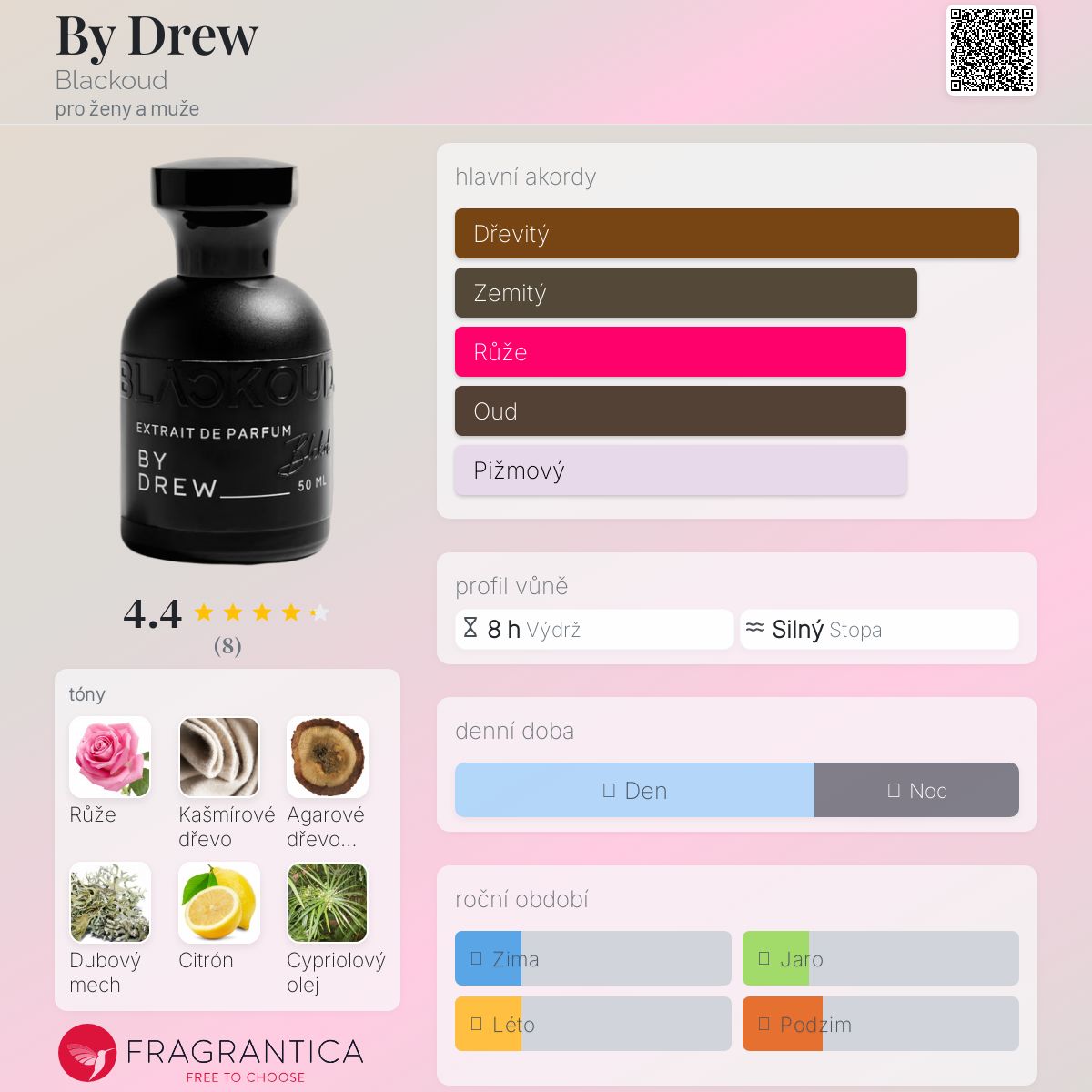 By Drew podle Blackoud je Woody Spicy vůně pro ženy a muže. Vrchní tóny jsou Růže, Citrón a Cypriolový olej; střední tóny jsouKašmírové dřevo, Ozonové tóny a Jantar (ambra) ; základní tóny jsou Agarové dřevo (oud), Mech a Pižmo.