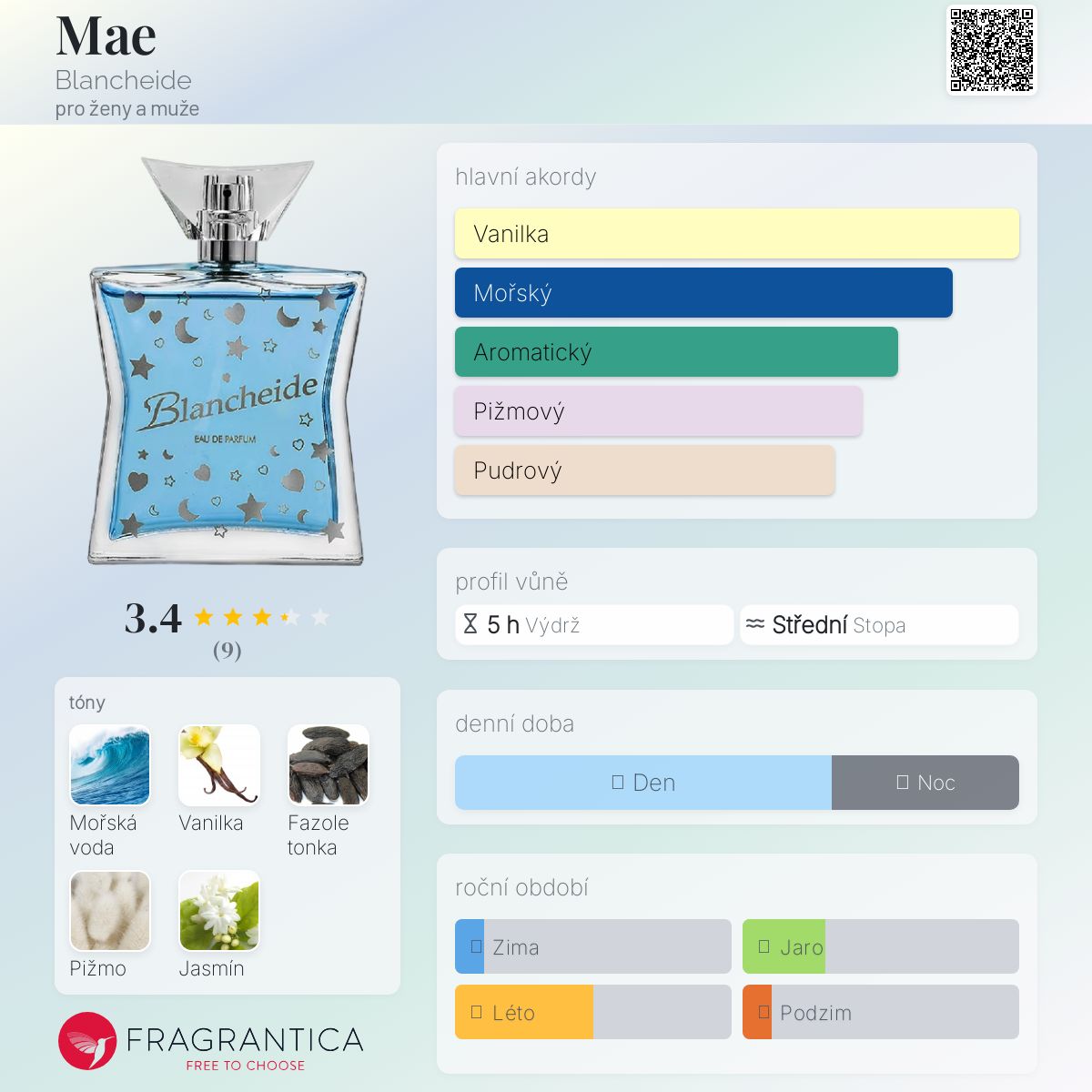 Mae podle Blancheide je Aromatic Aquatic vůně pro ženy a muže. Mae byl/a uveden/a v roce 2016. Vrchní tón je Jasmín ; střední tón jeMořské tóny ; základní tóny jsou Madagaskarská vanilka, Fazole tonka a Pižmo.