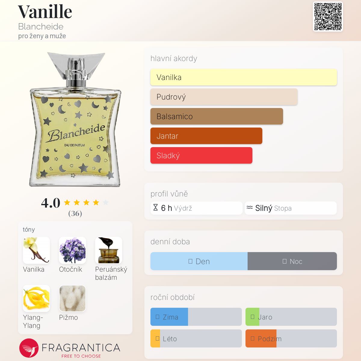 Vanille podle Blancheide je Orientální vůně pro ženy a muže. Vanille byl/a uveden/a v roce 2016. Vrchní tón je Ylang-Ylang ; střední tóny jsouOtočník a Pižmo ; základní tóny jsou Madagaskarská vanilka a Peruánský balzám.