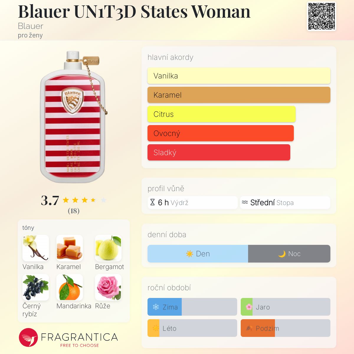 Blauer UN1T3D States Woman podle Blauer je Chypre Floral vůně pro ženy. Blauer UN1T3D States Woman byl/a uveden/a v roce 2019. "Nosem" za touto vůní je Alexandra Monet. Vrchní tóny jsou Bergamot, Černý rybíz a Mandarinka; střední tóny jsouRůže, Orris a Vonokvětka ; základní tóny jsou Vanilka, Karamel, Pačuli a Jantar (ambra).