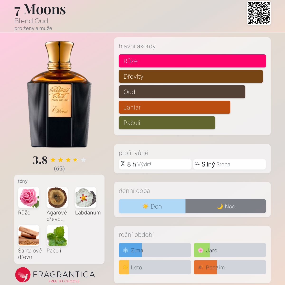 7 Moons podle Blend Oud je Woody Floral Musk vůně pro ženy a muže. 7 Moons byl/a uveden/a v roce 2016. Vrchní tón je Labdanum ; střední tón jePačuli ; základní tóny jsou Růže, Agarové dřevo (oud) a Santalové dřevo.