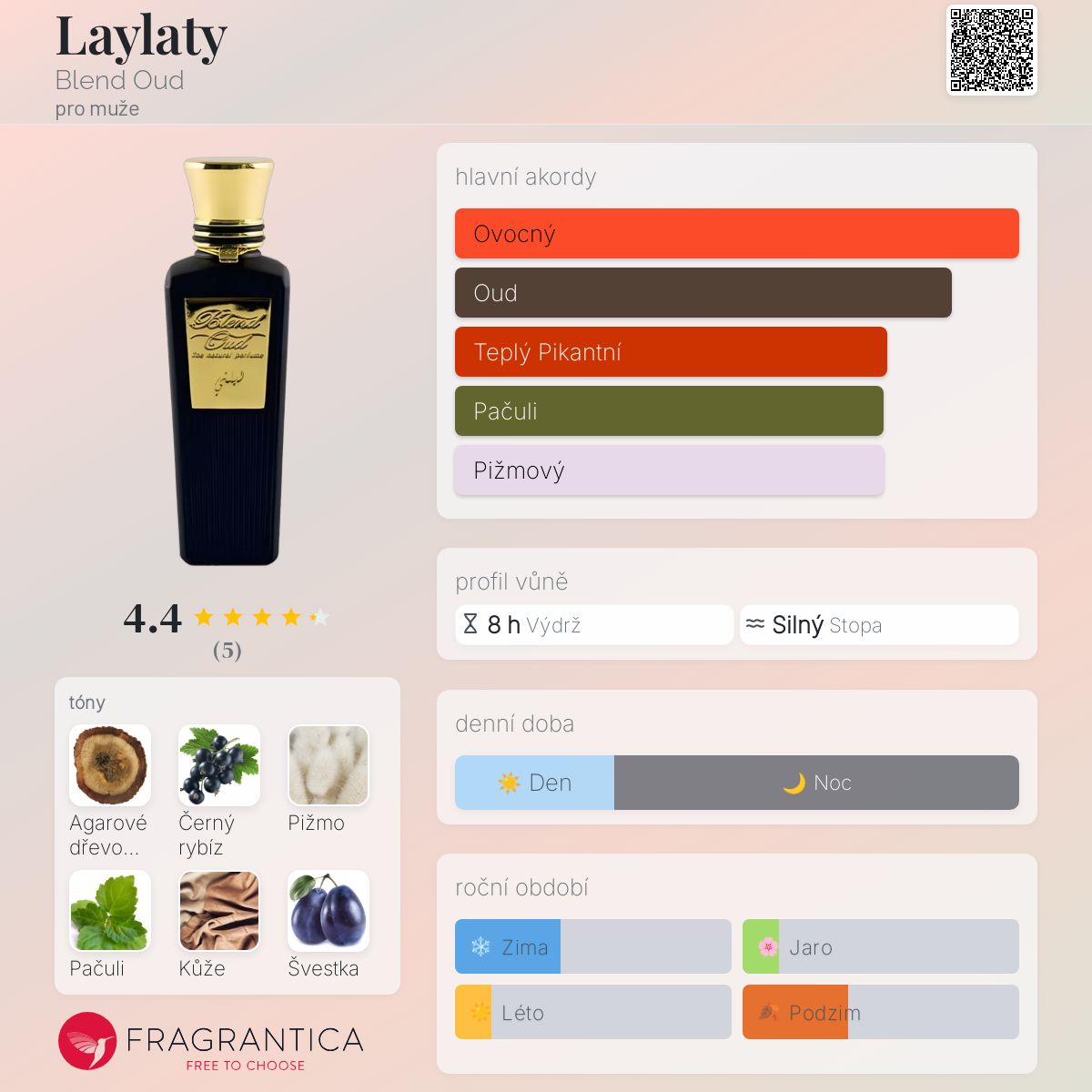 Laylaty podle Blend Oud je Leather vůně pro muže. Vrchní tóny jsou Černý rybíz, Kořeněné tóny, Šafrán, Šalvěj muškátová a Skořice; střední tóny jsouKůže a Švestka ; základní tóny jsou Agarové dřevo (oud), Bílé pižmo a Pačuli.