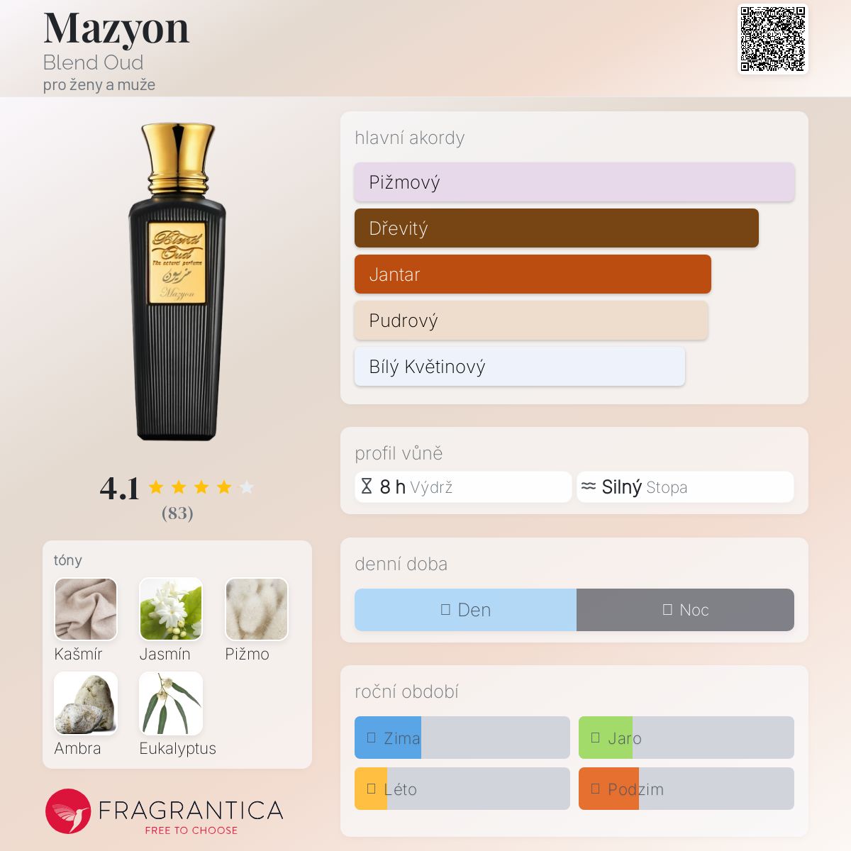 Mazyon podle Blend Oud je Orientální vůně pro ženy a muže. Vrchní tón je Jasmín Sambac ; střední tóny jsouKašmír a Eukalyptus ; základní tóny jsou Bílé pižmo a Ambra.
