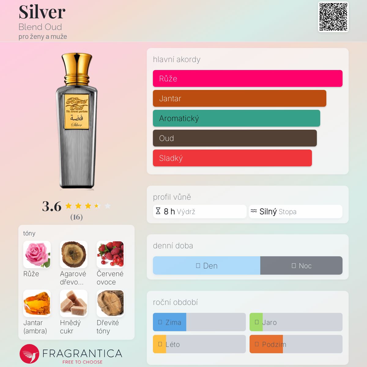 Silver podle Blend Oud je Orientální Woody vůně pro ženy a muže. Silver byl/a uveden/a v roce 2022. Vrchní tóny jsou Červené ovoce, Koriandr, Máta a Mandarinka; střední tóny jsouTurecká růže, Hnědý cukr, Pelargónie, Heřmánek, Jasmín a Orris ; základní tóny jsou Agarové dřevo (oud), Jantar (ambra), Dřevité tóny, Skořice, Vanilka, Benzoin a Pižmo.