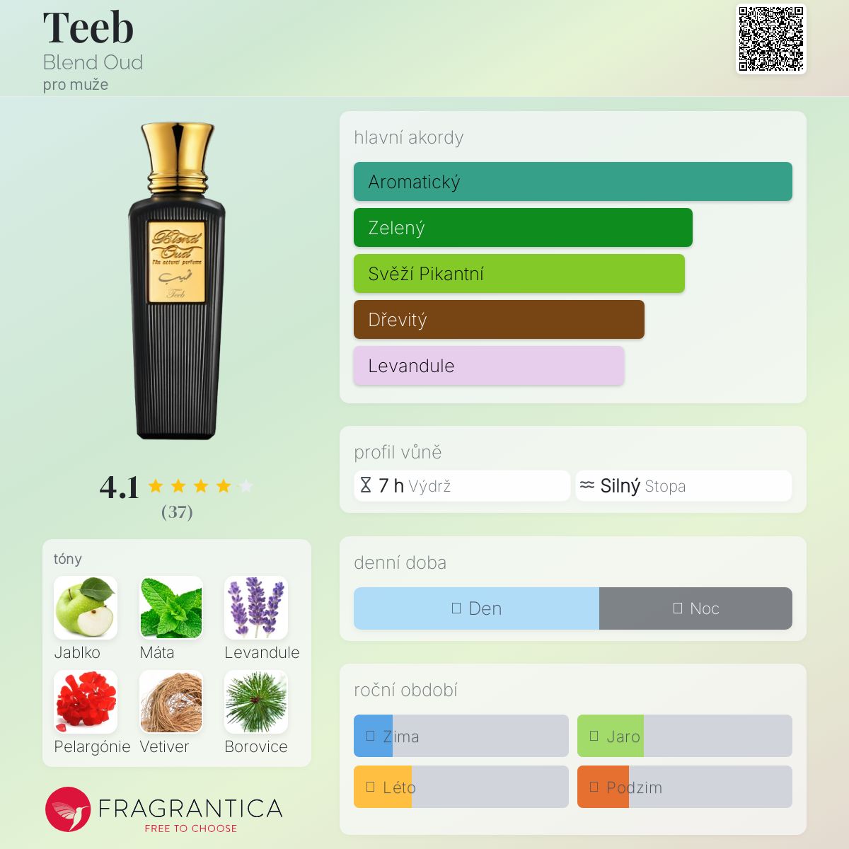 Teeb podle Blend Oud je Orientální Spicy vůně pro muže. Vrchní tóny jsou Zelené jablko, Máta a Levandule; střední tóny jsouPelargónie, Hřebíček a Šalvěj muškátová ; základní tóny jsou Vetiver, Jehličí borovice, Mech a Pačuli.