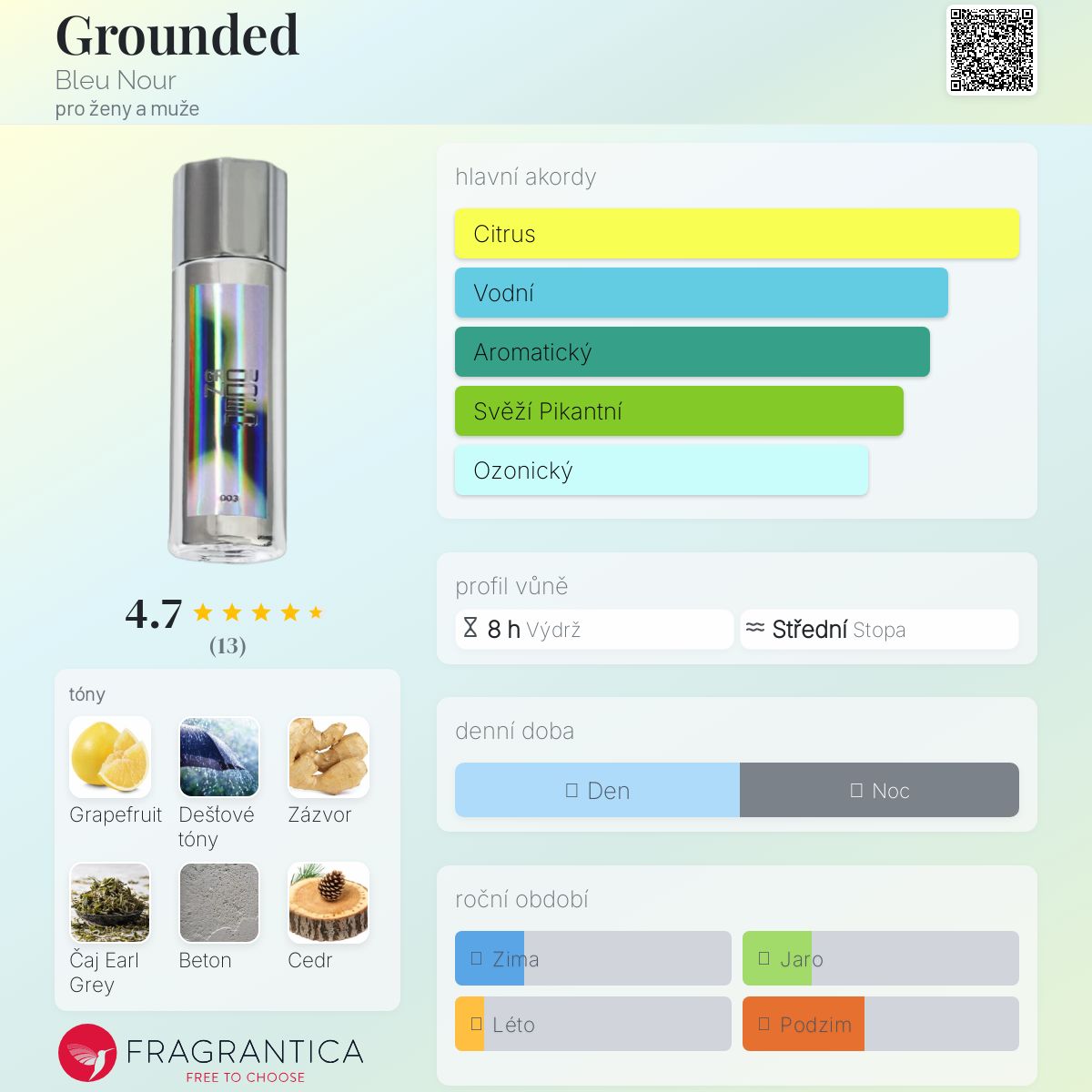 Grounded podle Bleu Nour je Woody Aromatic vůně pro ženy a muže. Toto je nová vůně. Grounded byl/a uveden/a v roce 2024. "Nosem" za touto vůní je Nour Ibrahim. Vrchní tóny jsou Grapefruit a Zázvor; střední tón jeČaj Earl Grey ; základní tóny jsou Dešťové tóny, Beton, Cedr a Fazole tonka.