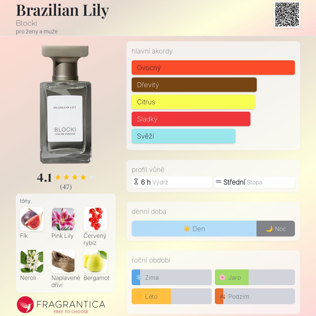 Brazilian Lily podle Blocki je Floral Fruity vůně pro ženy a muže. Brazilian Lily byl/a uveden/a v roce 2023. "Nosem" za touto vůní je Michelle Bruckmann. Vrchní tóny jsou Červený rybíz, Neroli a Bergamot; střední tóny jsouFík a Růžová lilie ; základní tóny jsou Naplavené dříví, Pižmo a Jantar (ambra).