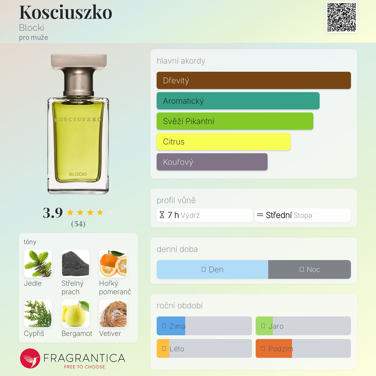 Kosciuszko podle Blocki je Aromatic Green vůně pro muže. Kosciuszko byl/a uveden/a v roce 2015. "Nosem" za touto vůní je Duff Scott. Vrchní tóny jsou Hořký pomeranč, Bergamot a Černý pepř; střední tóny jsouJedle, Střelný prach, Tabák a Koňak ; základní tóny jsou Cypřiš, Vetiver, Texaský cedr a Pižmo.