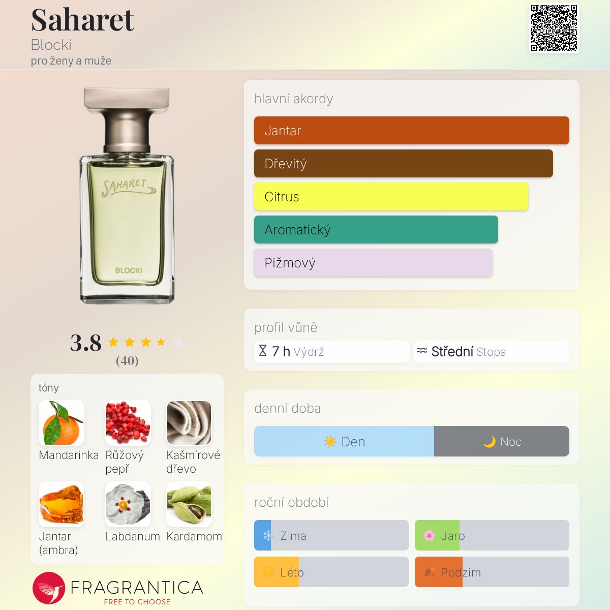 Saharet podle Blocki je Aromatic Spicy vůně pro ženy a muže. Saharet byl/a uveden/a v roce 2015. "Nosem" za touto vůní je Lionel Nesbitt. Vrchní tóny jsou Mandarinka, Růžový pepř a Kardamom; střední tóny jsouKašmírové dřevo, Jantar (ambra) a Pelargónie ; základní tóny jsou Labdanum, Vetiver a Pačuli.