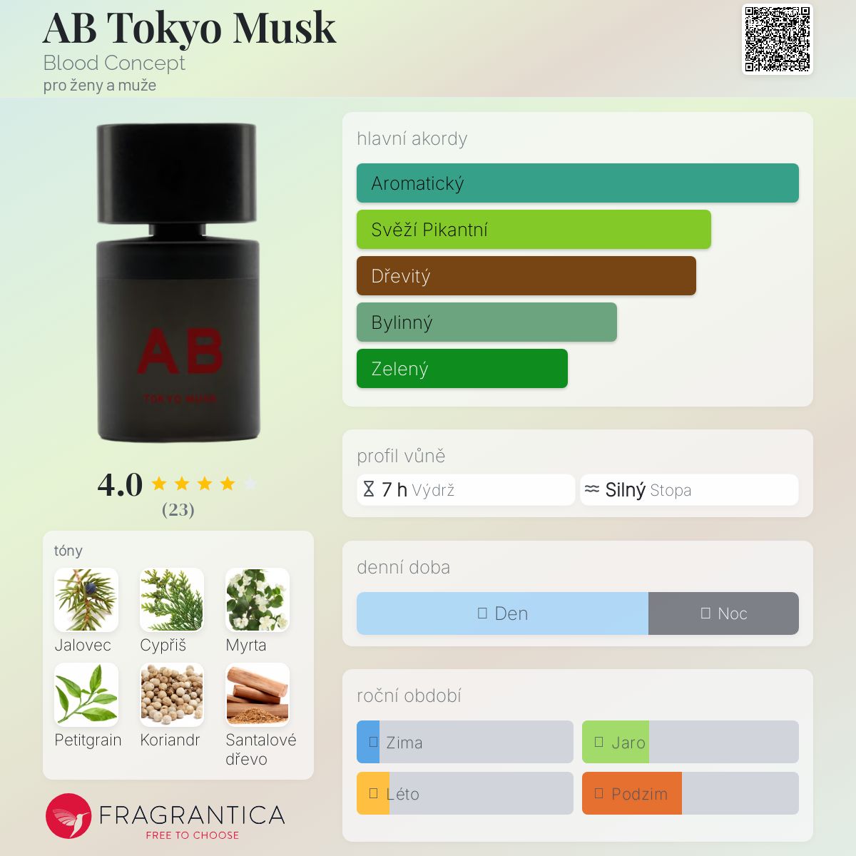 AB Tokyo Musk podle Blood Concept je Woody Aromatic vůně pro ženy a muže. AB Tokyo Musk byl/a uveden/a v roce 2015. "Nosem" za touto vůní je Celine Ripert. Vrchní tóny jsou Jalovec, Cypřiš a Myrta; střední tóny jsouPetitgrain a Koriandr ; základní tóny jsou Santalové dřevo, Guajakové dřevo a Pižmo.