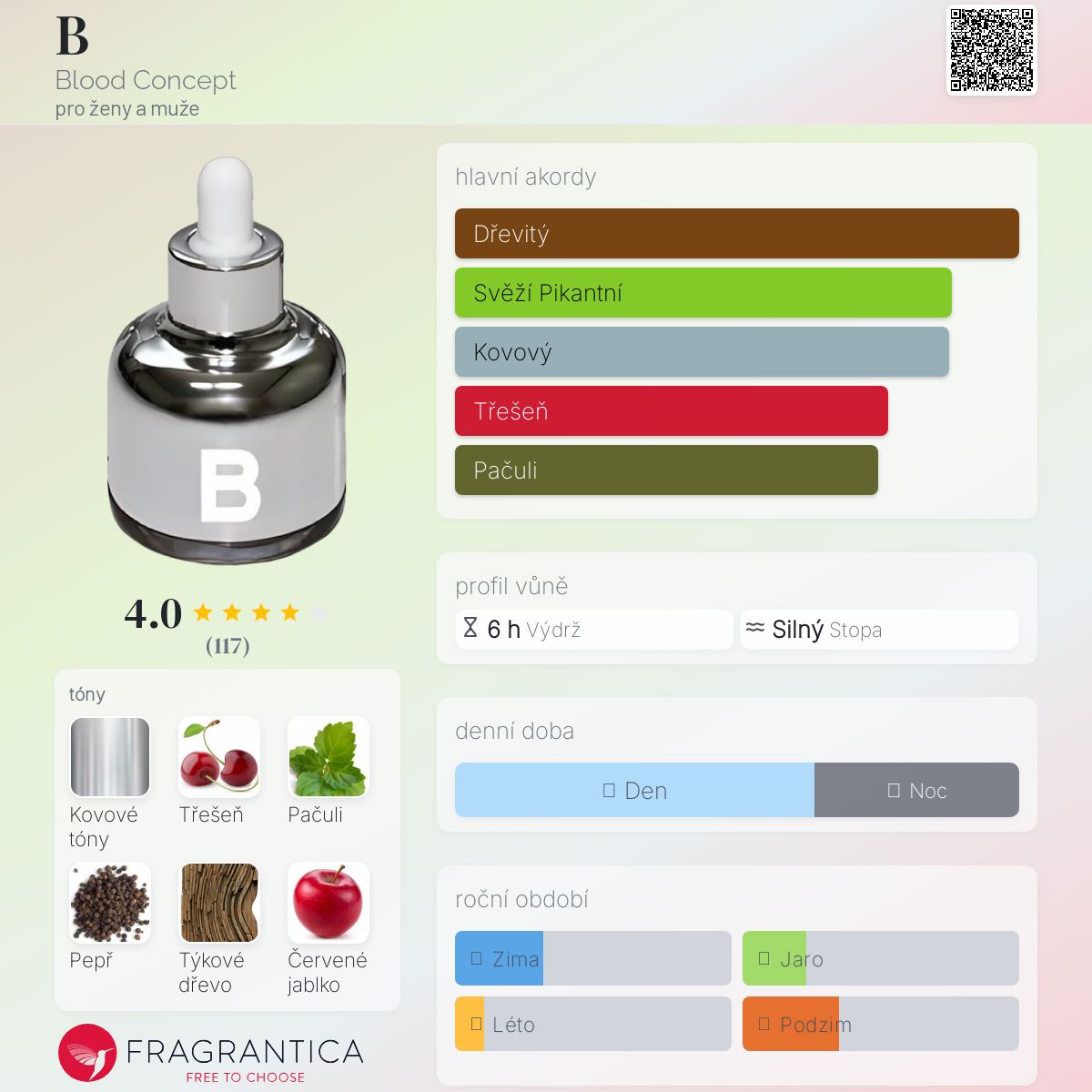 B podle Blood Concept je Woody Aromatic vůně pro ženy a muže. B byl/a uveden/a v roce 2011. Vrchní tóny jsou Třešeň a Červené jablko; střední tóny jsouPepř, Pelyněk, Čaj a Granátové jablko ; základní tóny jsou Kovové tóny, Pačuli a Týkové dřevo.