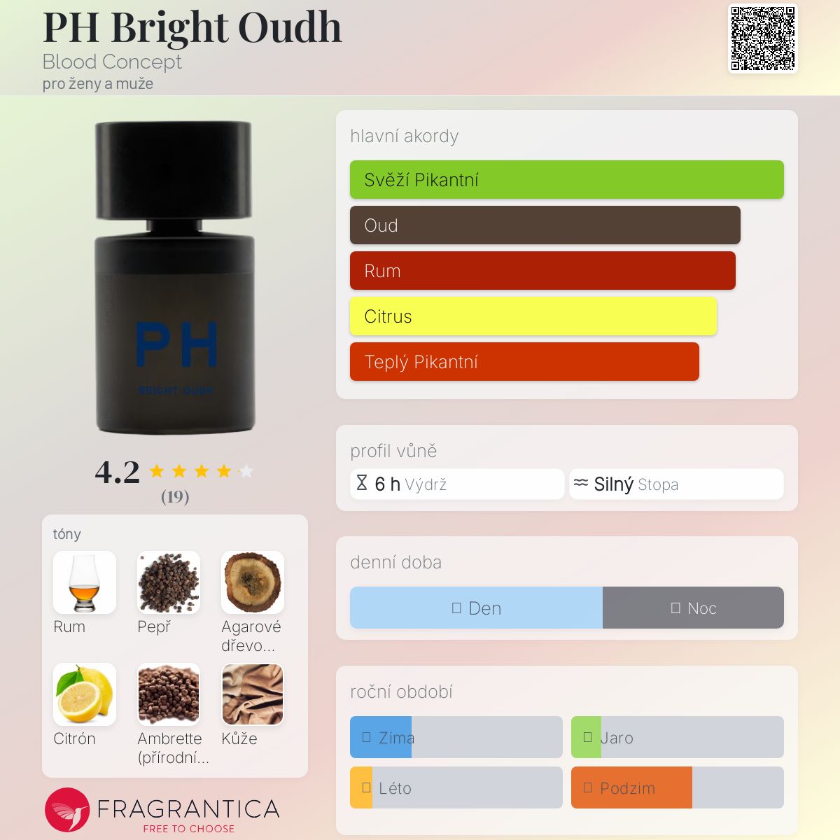 PH Bright Oudh podle Blood Concept je Orientální vůně pro ženy a muže. PH Bright Oudh byl/a uveden/a v roce 2015. "Nosem" za touto vůní je Cyrill Rolland. Vrchní tóny jsou Rum, Černý pepř a Citrón; střední tón jeAgarové dřevo (oud) ; základní tóny jsou Agarové dřevo (oud), Ambrette (přírodní pižmo), Kůže a Pačuli.