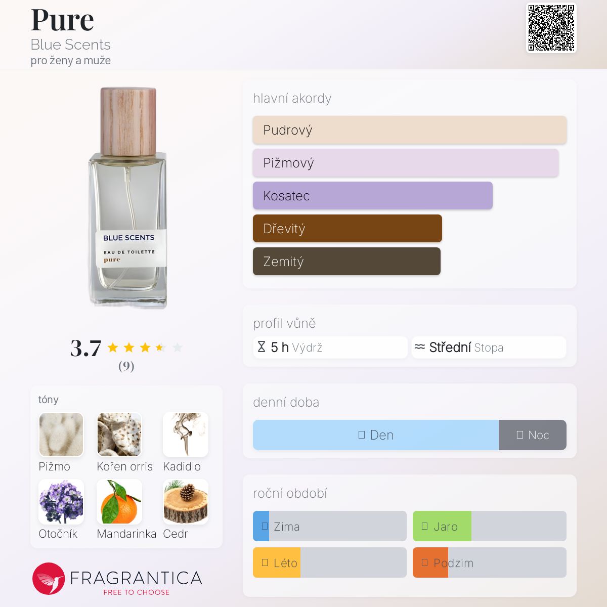 Pure podle Blue Scents je vůně pro ženy a muže. Pure byl/a uveden/a v roce 2016. Vrchní tón je Mandarinka ; střední tóny jsouKořen orris, Kadidlo, Cedr a Jasmín ; základní tóny jsou Bílé pižmo, Otočník, Pačuli a Vetiver.