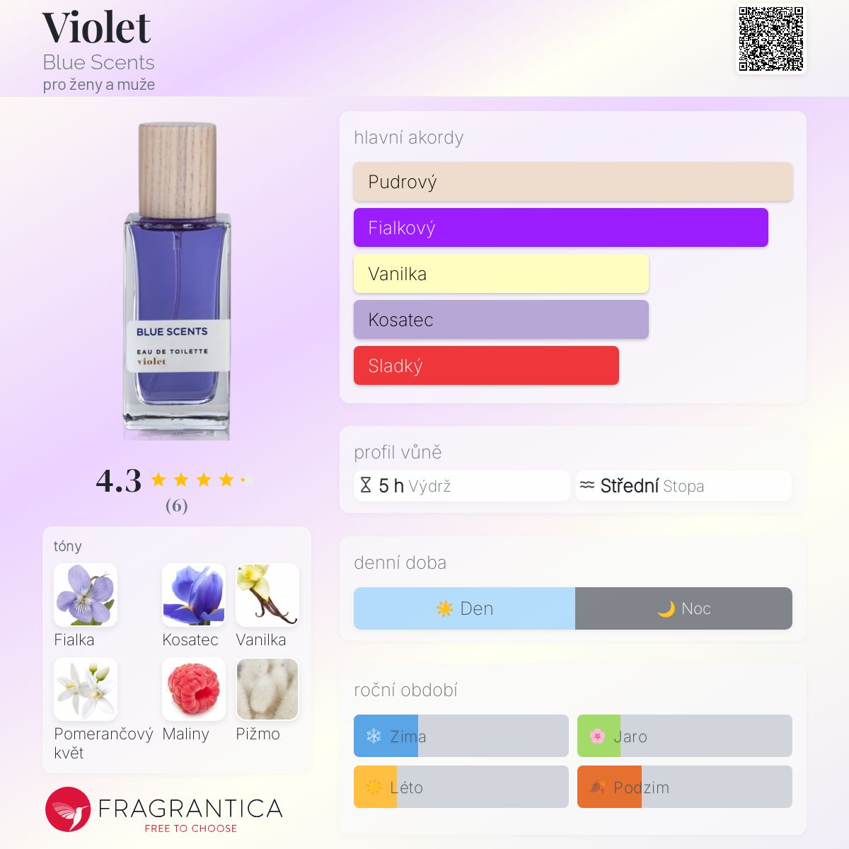 Violet podle Blue Scents je vůně pro ženy a muže. Violet byl/a uveden/a v roce 2016. Vrchní tóny jsou Kosatec a Pomerančový květ; střední tóny jsouFialka a Maliny ; základní tóny jsou Vanilka a Pižmo.