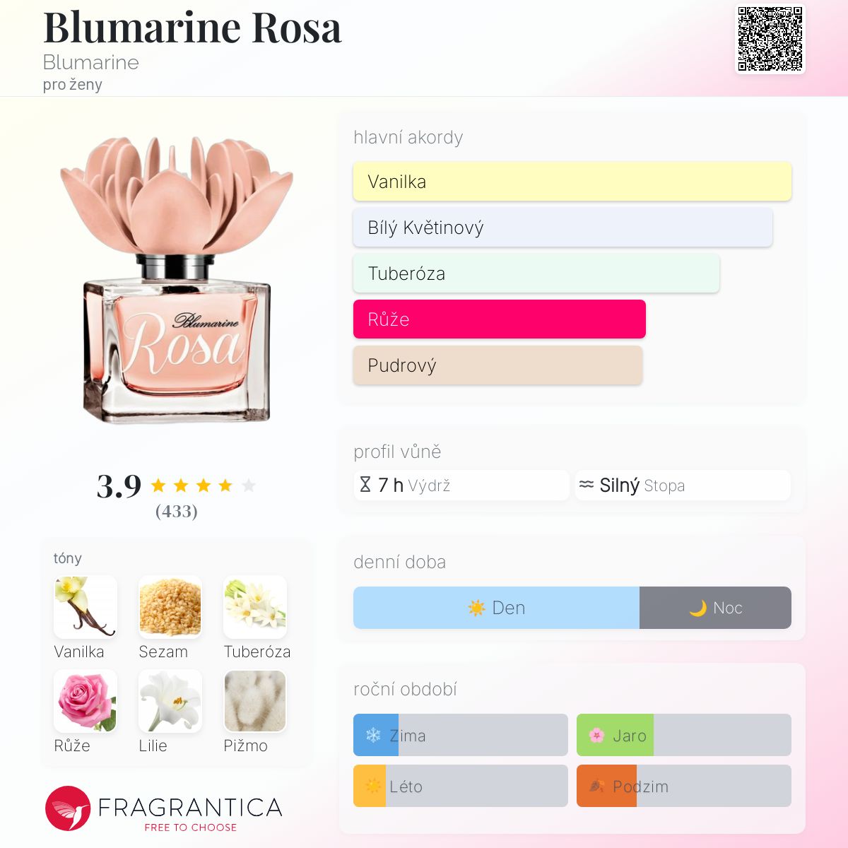 Blumarine Rosa podle Blumarine je Orientální Floral vůně pro ženy. Blumarine Rosa byl/a uveden/a v roce 2016. "Nosem" za touto vůní je Sophie Labbe. Vrchní tóny jsou Sezam, Frézie a Bergamot; střední tóny jsouTuberóza, Okvětní lístky růží a Bílá lilie ; základní tóny jsou Vanilka, Pižmo a Pačuli.