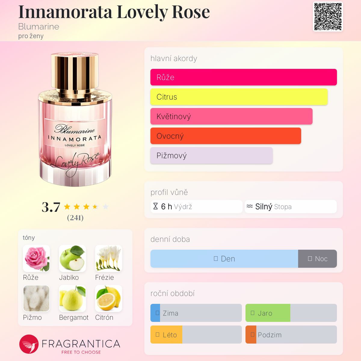 Innamorata Lovely Rose podle Blumarine je Floral Fruity vůně pro ženy. Innamorata Lovely Rose byl/a uveden/a v roce 2013. Innamorata Lovely Rose byl/a vytvořen/a Francis Kurkdjian a Philippe Bousseton. Vrchní tóny jsou Zelené jablko, Bergamot, Citrón, Maliny a Limetka; střední tóny jsouOkvětní lístky růží, Frézie a Gardénie ; základní tóny jsou Pižmo, Cedr a Jantar (ambra).