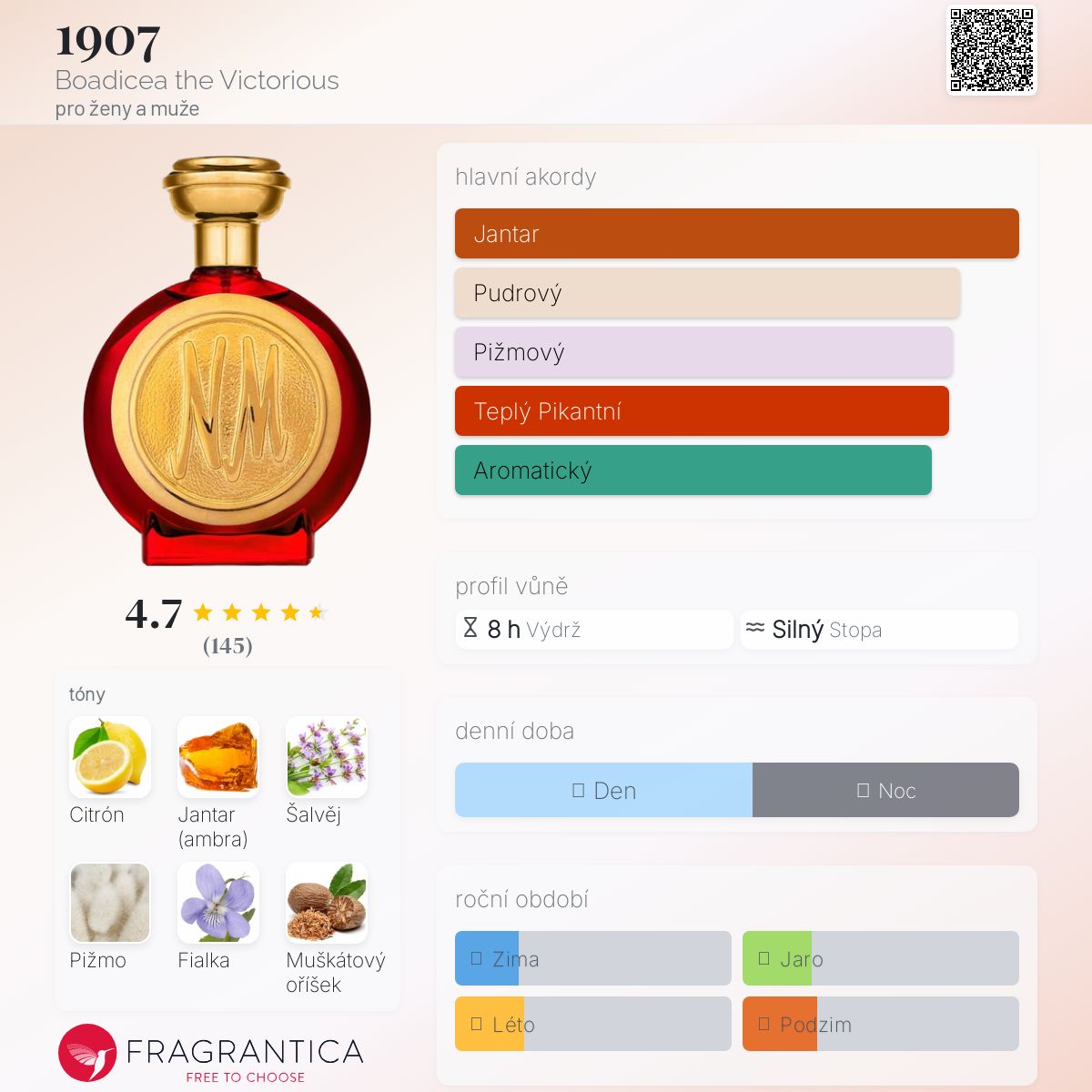 1907 podle Boadicea the Victorious je Woody Spicy vůně pro ženy a muže. Toto je nová vůně. 1907 byl/a uveden/a v roce 2024. Vrchní tóny jsou Citrón, Kardamom, Skořice a Růžový pepř; střední tóny jsouŠalvěj, Fialka, Muškátový oříšek a Kašmír ; základní tóny jsou Jantar (ambra), Pižmo, Tabák, Fazole tonka, Benzoin, Cedr a Mech.