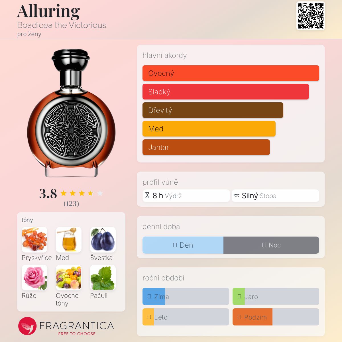 Alluring podle Boadicea the Victorious je Floral Fruity vůně pro ženy. "Nosem" za touto vůní je John Stephen. Vrchní tóny jsou Švestka, Ovocné tóny a Červené bobule; střední tóny jsouMed, Tinktura z růže a Ylang-Ylang ; základní tóny jsou Pryskyřice, Pačuli, Dřevité tóny a Pižmo.