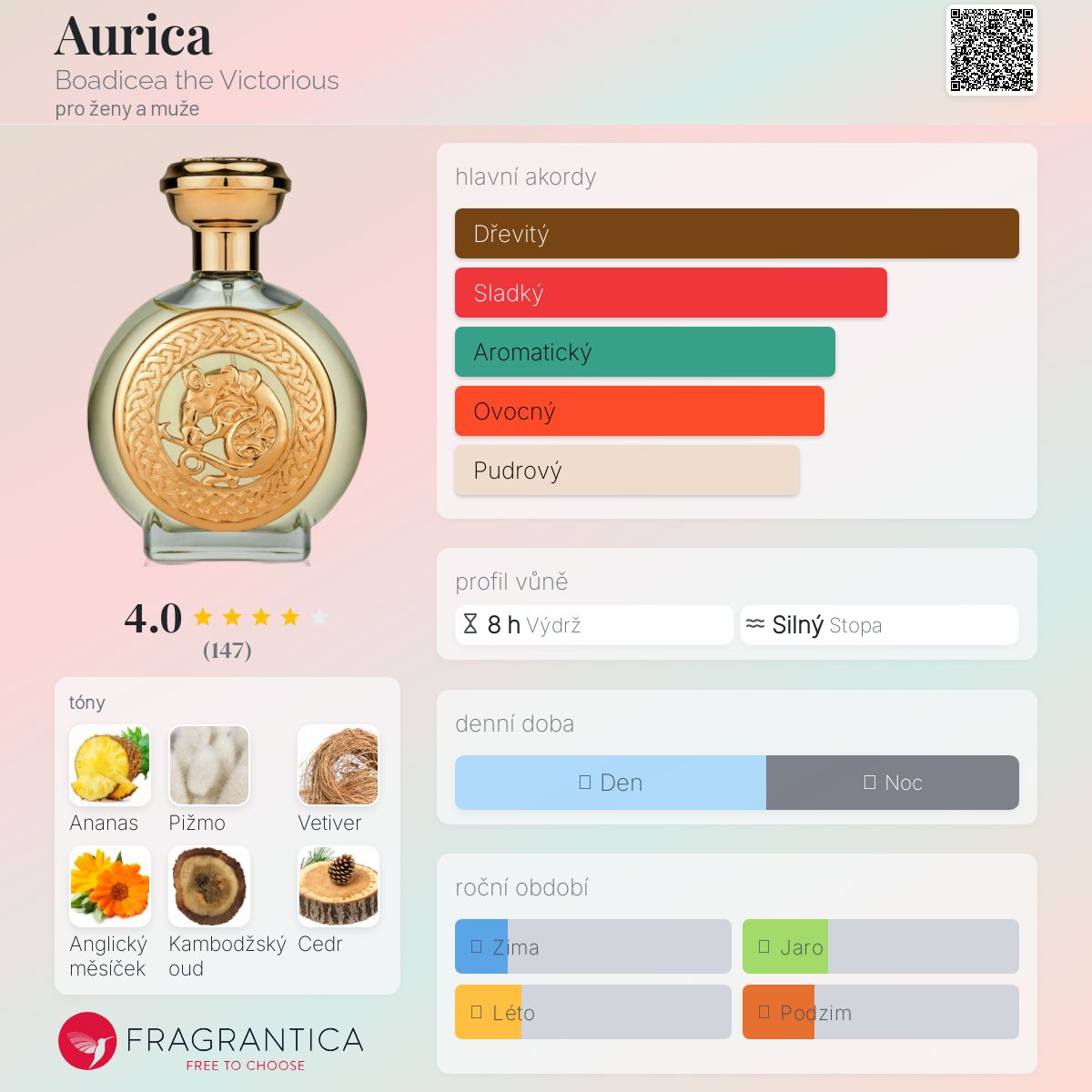 Aurica podle Boadicea the Victorious je Orientální Woody vůně pro ženy a muže. Aurica byl/a uveden/a v roce 2020. "Nosem" za touto vůní je Christian Provenzano. Vrchní tóny jsou Ananas, Cedrové jehly, Mandarinka a Ylang-Ylang; střední tóny jsouMěsíček, Kambodžský oud, Jasmín a Růže ; základní tóny jsou Pižmo, Vetiver, Pačuli, Santalové dřevo, Vanilka, Mech a Jantar (ambra).