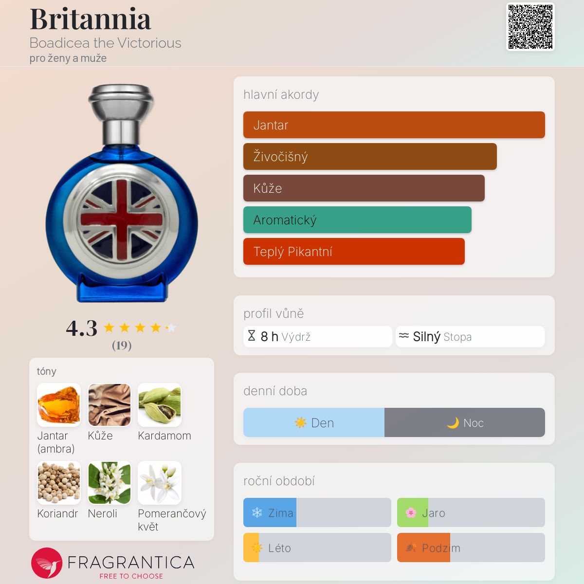 Britannia podle Boadicea the Victorious je Woody Spicy vůně pro ženy a muže. Britannia byl/a uveden/a v roce 2018. Vrchní tóny jsou Jantar (ambra), Kardamom a Koriandr; střední tóny jsouNeroli a Pomerančový květ ; základní tóny jsou Kůže, Ambra a Dřevité tóny.