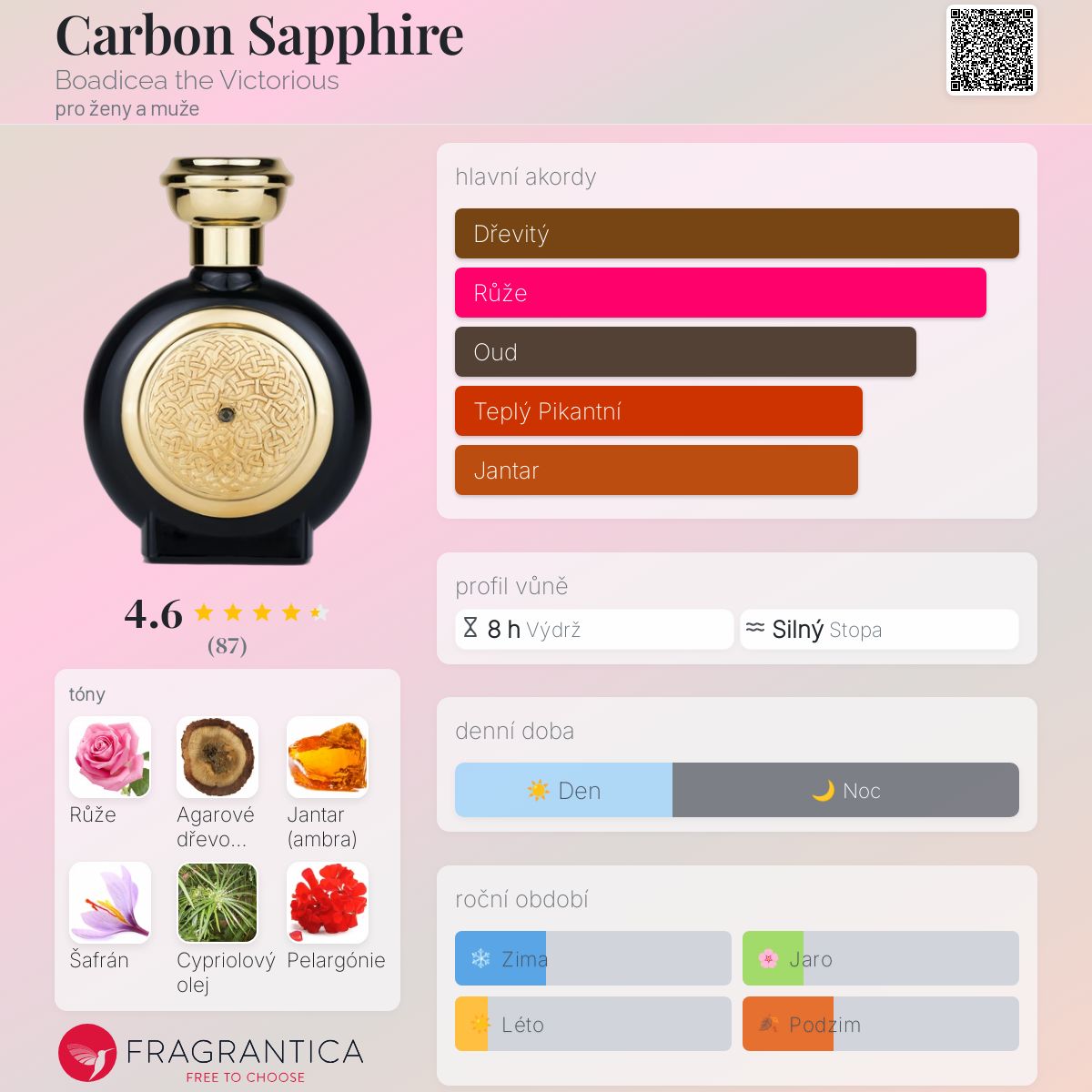 Carbon Sapphire podle Boadicea the Victorious je vůně pro ženy a muže. Carbon Sapphire byl/a uveden/a v roce 2019. Vrchní tóny jsou Bulharská růže, Pelargónie, Palisandr a Egyptský jasmín; střední tóny jsouRůže de Mai a Šafrán ; základní tóny jsou Agarové dřevo (oud), Křišťálový jantar, Cypriolový olej, Pižmo, Santalové dřevo, Guajakové dřevo, Kašmírové dřevo a Pačuli.