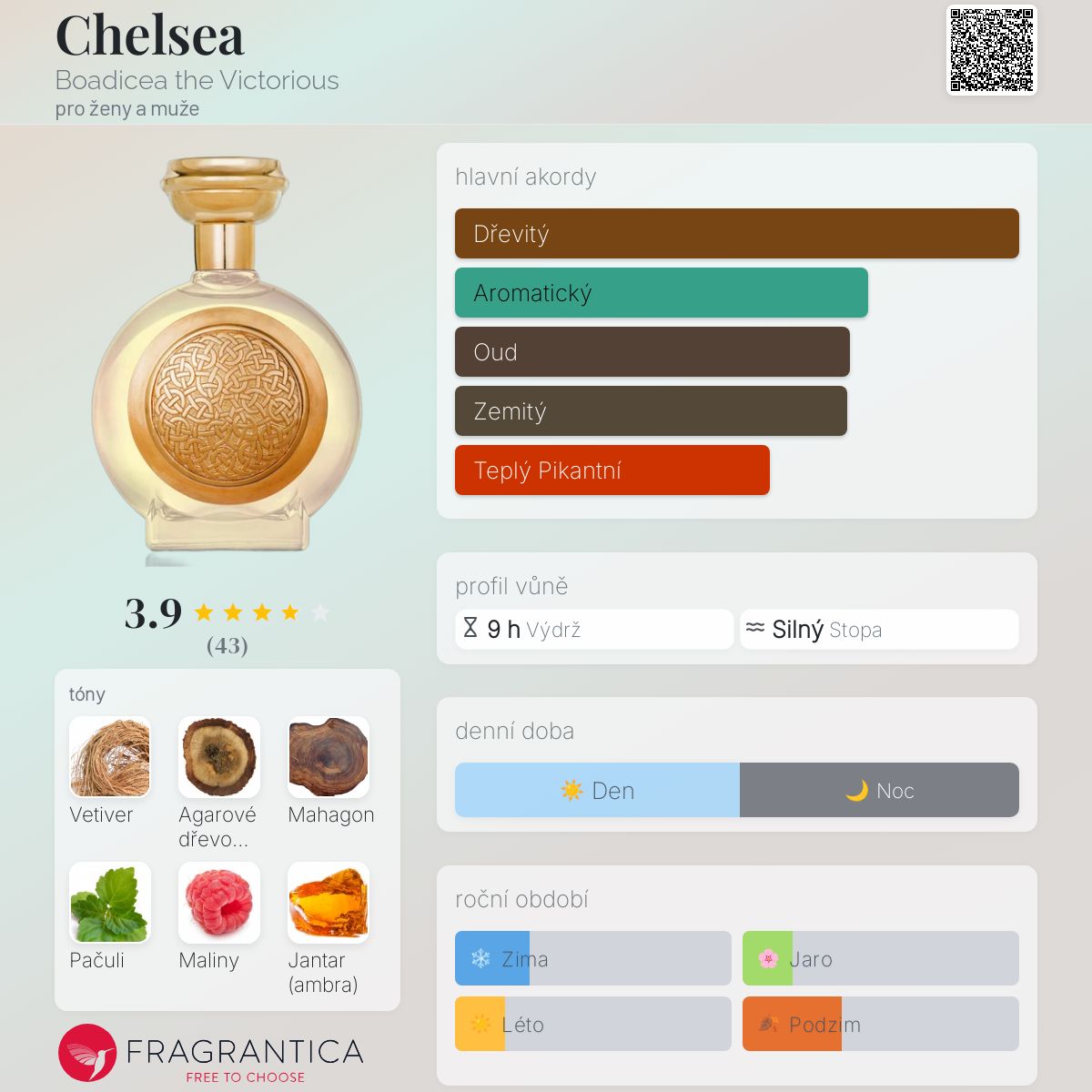 Chelsea podle Boadicea the Victorious je Woody vůně pro ženy a muže. Chelsea byl/a uveden/a v roce 2013. "Nosem" za touto vůní je Christian Provenzano. Vrchní tóny jsou Vetiver, Maliny a Bergamot; střední tóny jsouAgarové dřevo (oud), Cypriolový olej a Cedr ; základní tóny jsou Vetiver, Mahagon, Pačuli a Jantar (ambra).