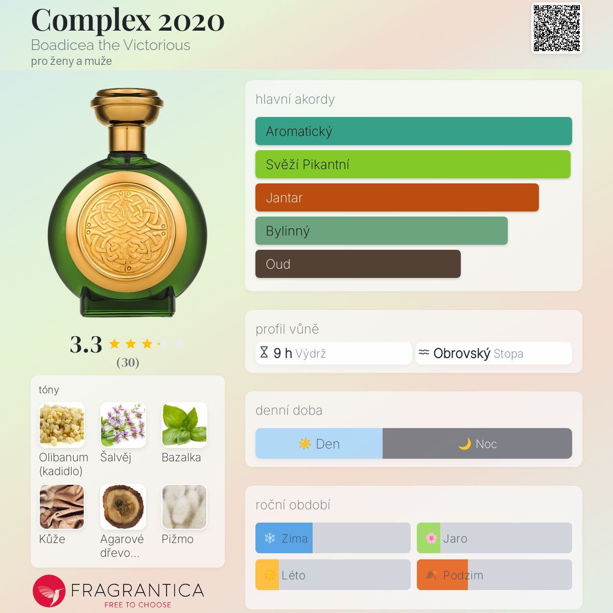 Complex 2020 podle Boadicea the Victorious je Leather vůně pro ženy a muže. Complex 2020 byl/a uveden/a v roce 2017. "Nosem" za touto vůní je John Stephen. Vrchní tóny jsou Šalvěj a Bazalka; střední tóny jsouOlibanum a Fialka ; základní tóny jsou Kůže, Agarové dřevo (oud) a Pižmo.