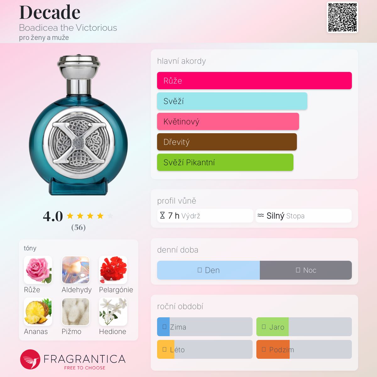 Decade podle Boadicea the Victorious je Orientální Floral vůně pro ženy a muže. Decade byl/a uveden/a v roce 2019. Vrchní tóny jsou Bulharská růže, Aldehydy, Ananas, Šafrán a Bergamot; střední tóny jsouRůže de Mai, Pelargónie, Hedione a Fialka ; základní tóny jsou Pižmo, Guajakové dřevo, Cypriolový olej, Jantar (ambra) a Pačuli.