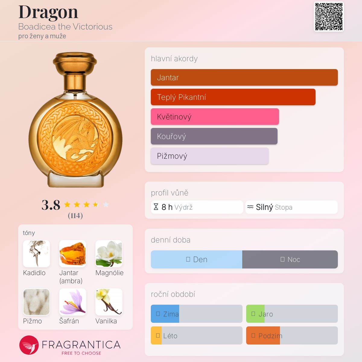 Dragon podle Boadicea the Victorious je vůně pro ženy a muže. Toto je nová vůně. Dragon byl/a uveden/a v roce 2024. Vrchní tóny jsou Šafrán, Skořice, Broskev a Maliny; střední tóny jsouKadidlo, Jantar (ambra), Magnólie a Turecká růže ; základní tóny jsou Kašmírové pižmo, Pižmo a Vanilka.