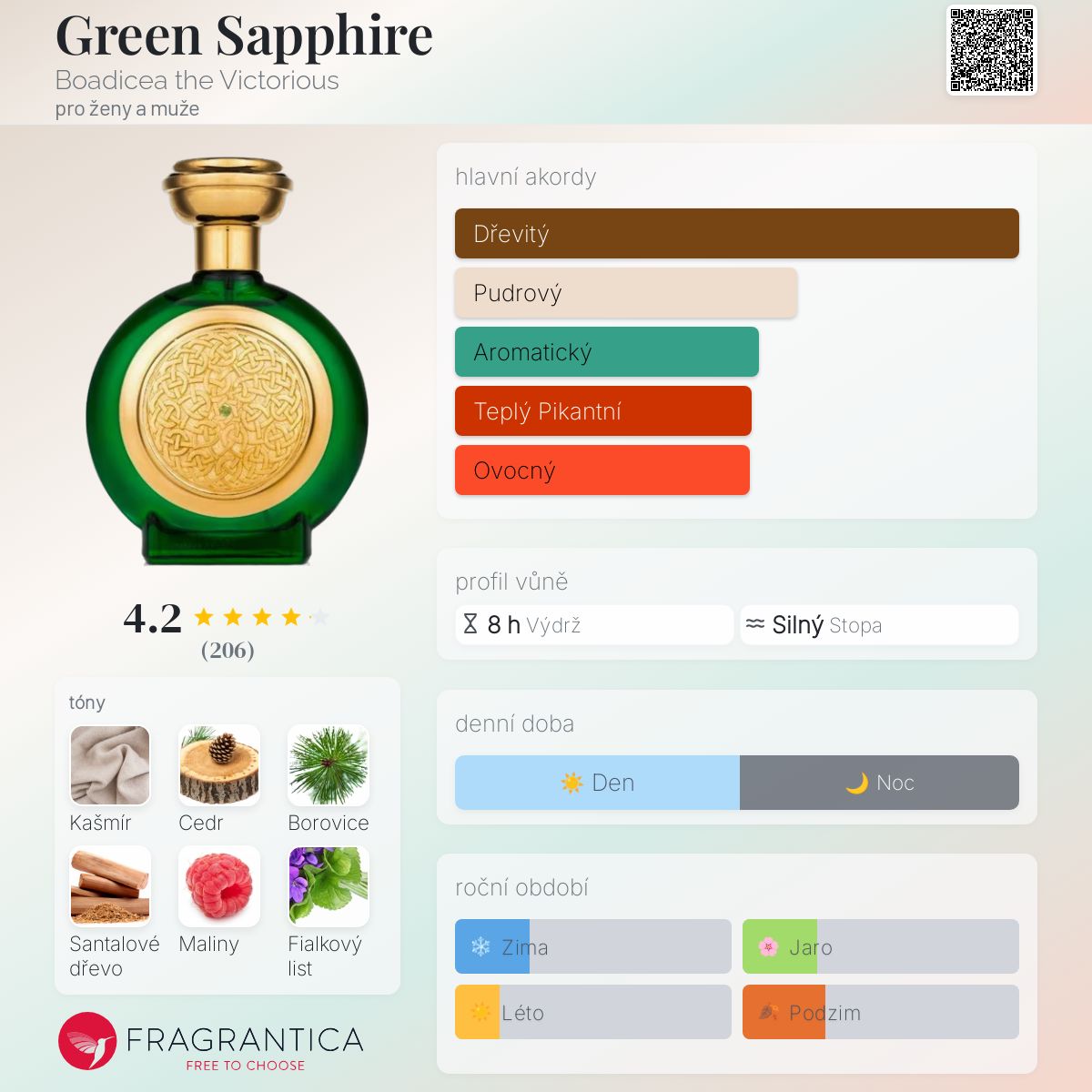 Green Sapphire podle Boadicea the Victorious je Orientální Woody vůně pro ženy a muže. Green Sapphire byl/a uveden/a v roce 2016. Vrchní tóny jsou Maliny, Fialkový list a Šafrán; střední tóny jsouKašmír a Jehličí borovice ; základní tóny jsou Atlasový cedr a Santalové dřevo.