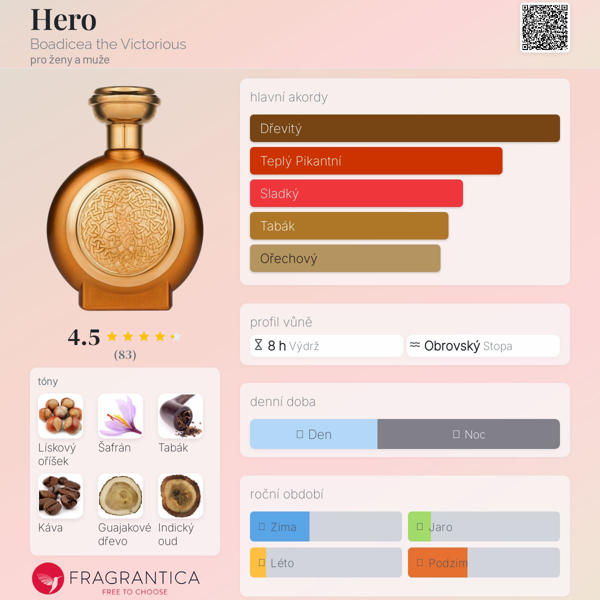 Hero podle Boadicea the Victorious je Orientální Spicy vůně pro ženy a muže. Hero byl/a uveden/a v roce 2016. Vrchní tóny jsou Lískový oříšek, Šafrán, Káva, Rebarbora a Ylang-Ylang; střední tóny jsouTabák, Pačuli, Fazole tonka, Santalové dřevo a Růže ; základní tóny jsou Guajakové dřevo, Indický oud, Jedlová pryskyřice, Siamský (thajský) benzoin, Cypriolový olej a Skalní růže.