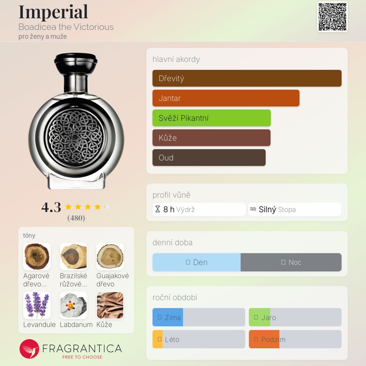 Imperial podle Boadicea the Victorious je Orientální Woody vůně pro ženy a muže. Imperial byl/a uveden/a v roce 2012. "Nosem" za touto vůní je Christian Provenzano. Vrchní tóny jsou Brazilské růžové dřevo, Levandule, Bříza a Andělika; střední tóny jsouPelargónie, Růže, Frézie a Jasmín ; základní tóny jsou Agarové dřevo (oud), Guajakové dřevo, Labdanum, Kůže, Jantar (ambra), Pačuli, Santalové dřevo, Olibanum, Cypriolový olej a Pižmo.