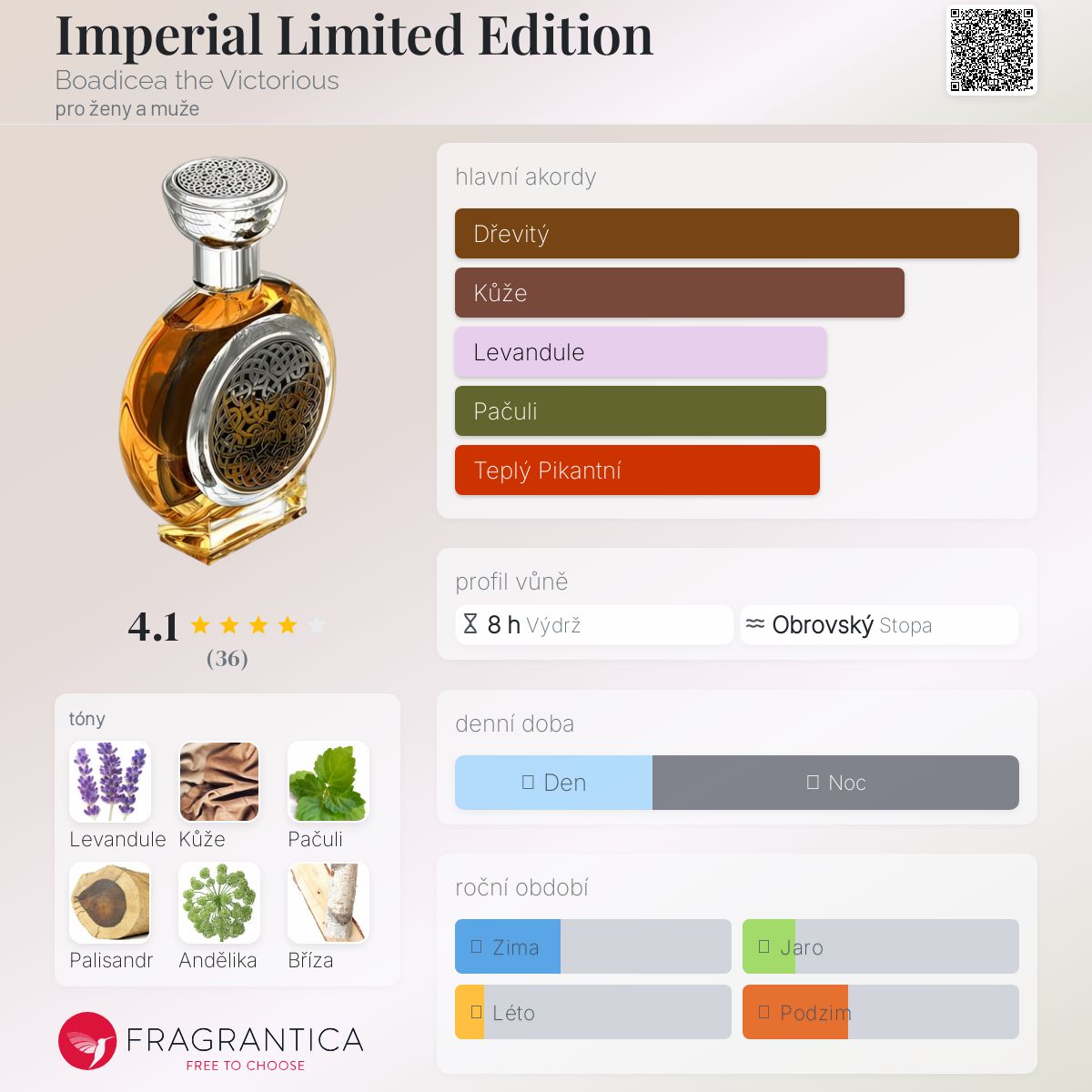 Imperial Limited Edition podle Boadicea the Victorious je Leather vůně pro ženy a muže. Imperial Limited Edition byl/a uveden/a v roce 2014. Vrchní tóny jsou Levandule, Palisandr, Andělika a Bříza; střední tóny jsouRůže, Frézie, Pelargónie a Jasmín ; základní tóny jsou Kůže, Pačuli, Santalové dřevo, Agarové dřevo (oud) a Guajakové dřevo.