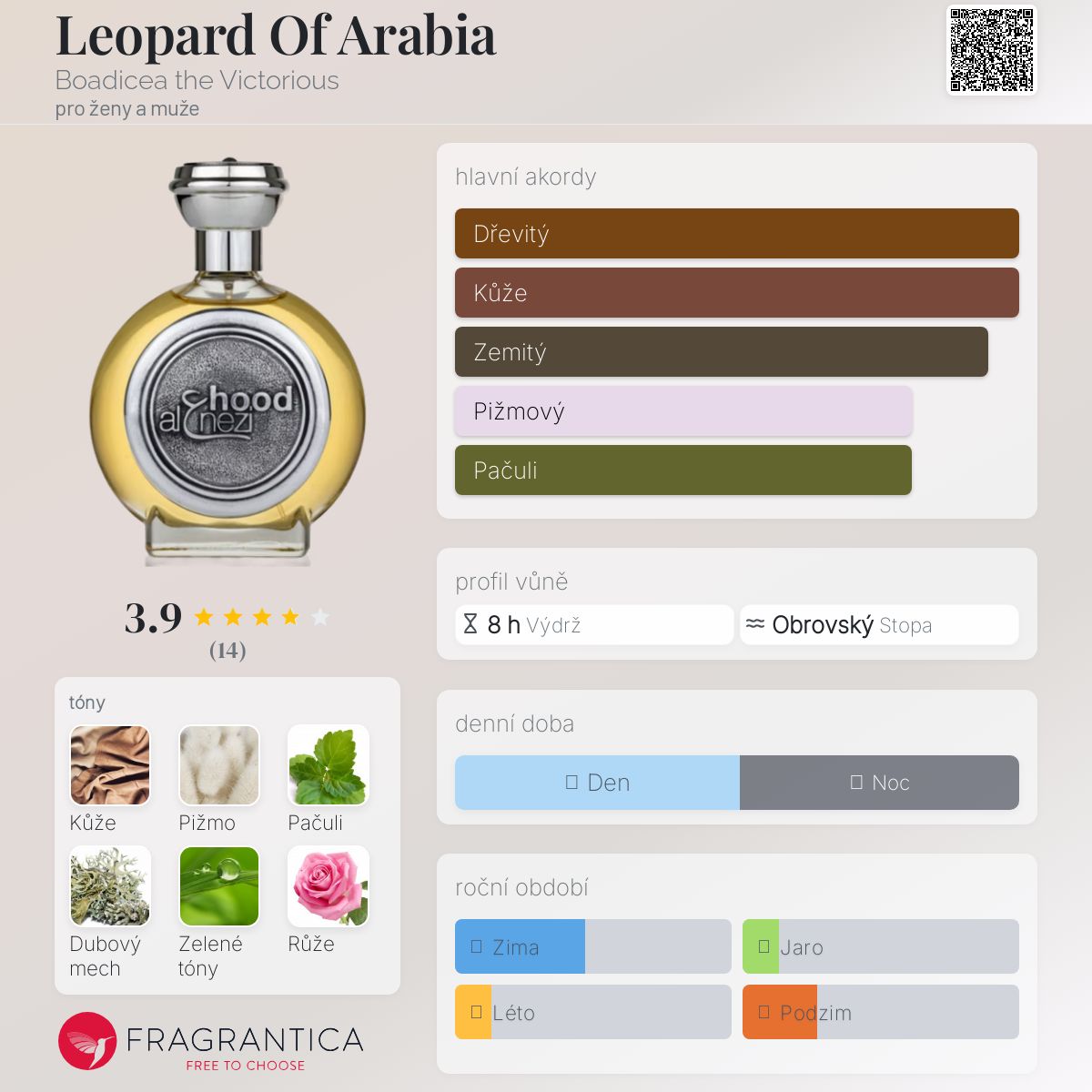 Leopard Of Arabia podle Boadicea the Victorious je vůně pro ženy a muže. Vrchní tóny jsou Bylinné tóny a Citrusy; střední tóny jsouRůže, Maliny, Jasmín, Šafrán a Černý pepř ; základní tóny jsou Kůže, Pižmo, Pačuli, Dubový mech, Cedr, Vanilka, Vetiver a Jantar (ambra).