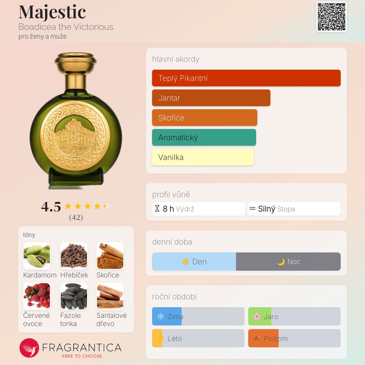 Majestic podle Boadicea the Victorious je Orientální Spicy vůně pro ženy a muže. Majestic byl/a uveden/a v roce 2019. Vrchní tóny jsou Kardamom, Červené ovoce, Labdanum a Citrón; střední tóny jsouHřebíček, Skořice, Labdanum, Růže, Šafrán, Kůže, Kadidlo, Konvalinka a Ylang-Ylang ; základní tóny jsou Fazole tonka, Santalové dřevo, Jantar (ambra), Pižmo, Vanilka, Pačuli, Agarové dřevo (oud) a Dubový mech.