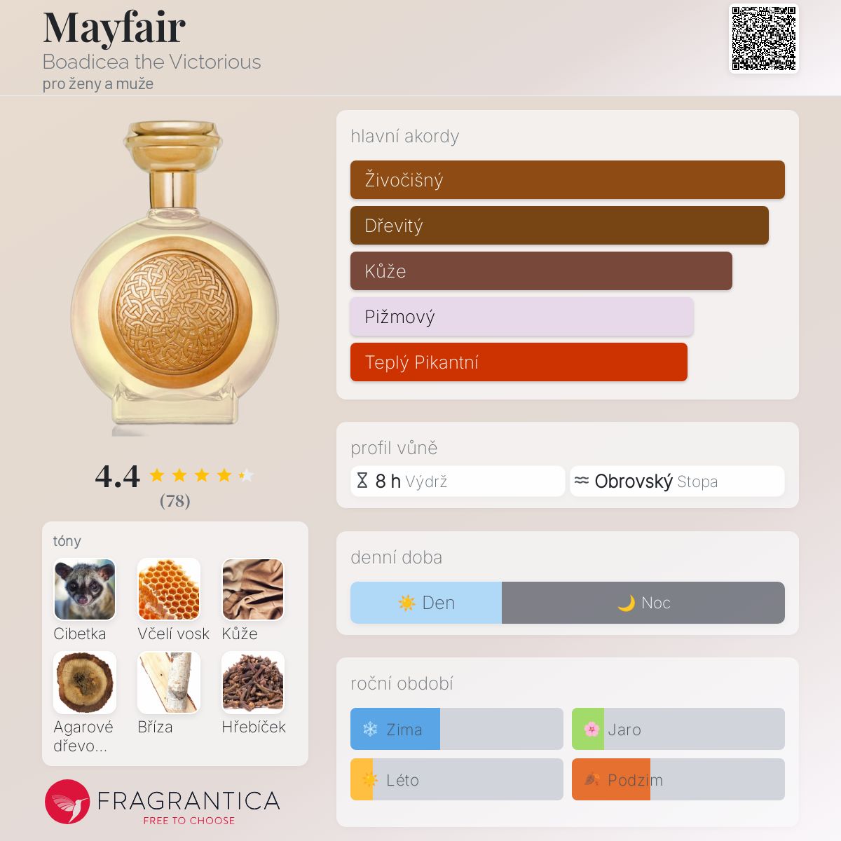 Mayfair podle Boadicea the Victorious je Orientální Woody vůně pro ženy a muže. Mayfair byl/a uveden/a v roce 2013. "Nosem" za touto vůní je Christian Provenzano. Vrchní tóny jsou Včelí vosk, Bříza, Hřebíček a Kardamom; střední tóny jsouKůže, Turecká růže, Pomerančový květ a Jasmín ; základní tóny jsou Cibetka, Včelí vosk, Agarové dřevo (oud), Santalové dřevo, Jantar (ambra), Cedr, Pačuli, Vetiver, Cypriolový olej a Pižmo.