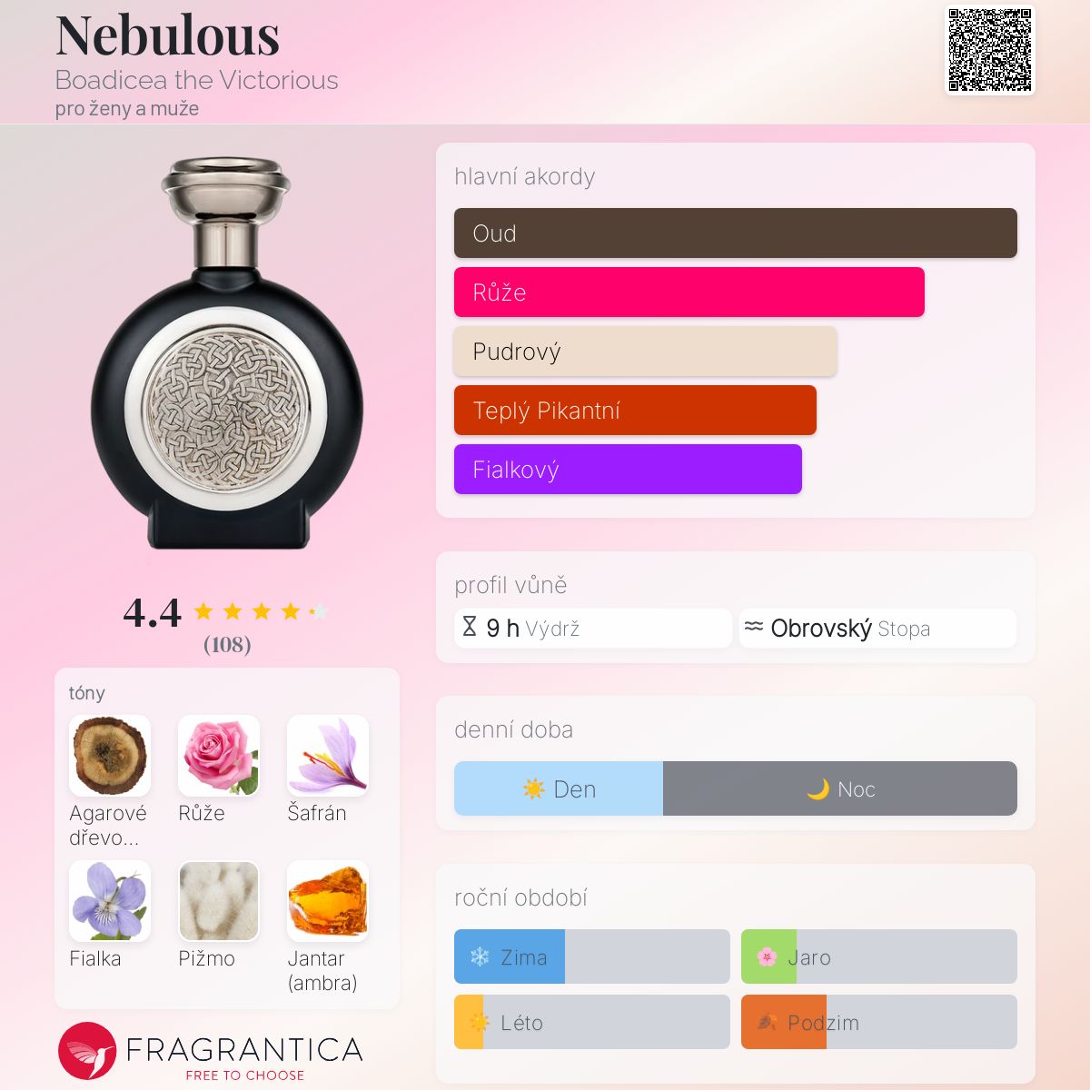 Nebulous podle Boadicea the Victorious je Orientální vůně pro ženy a muže. Nebulous byl/a uveden/a v roce 2017. "Nosem" za touto vůní je Christian Provenzano. Vrchní tóny jsou Růže a Šafrán; střední tóny jsouAgarové dřevo (oud) a Fialka ; základní tóny jsou Pižmo a Jantar (ambra).