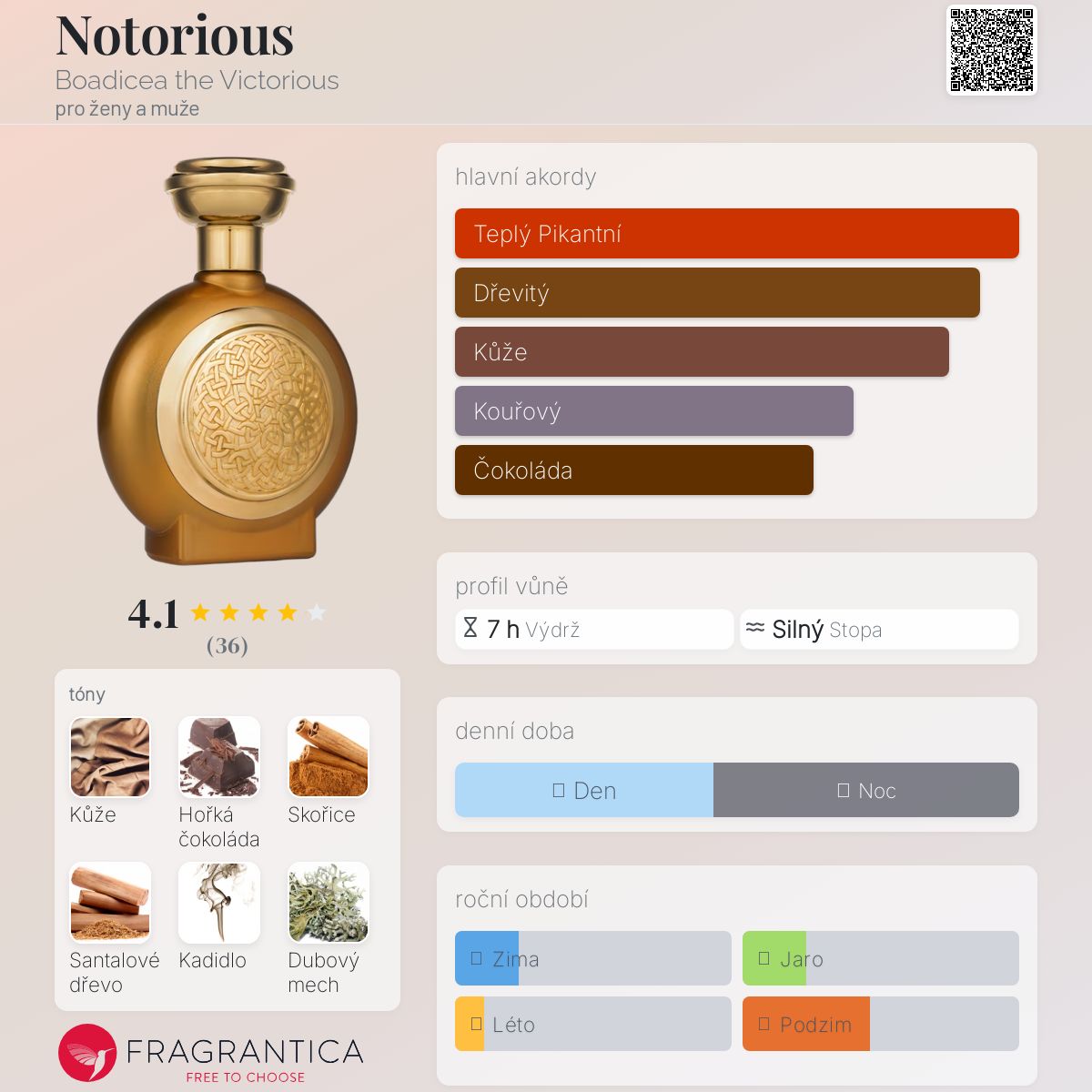 Notorious podle Boadicea the Victorious je Orientální Vanilla vůně pro ženy a muže. Notorious byl/a uveden/a v roce 2016. Vrchní tóny jsou Skořice, Ylang-Ylang, Šafrán a Sicilská mandarinka; střední tóny jsouHořká čokoláda, Kadidlo, Kastoreum a Skalní růže ; základní tóny jsou Kůže, Santalové dřevo, Mech, Pačuli, Haitský vetiver, Virginský cedr a Jantar (ambra).