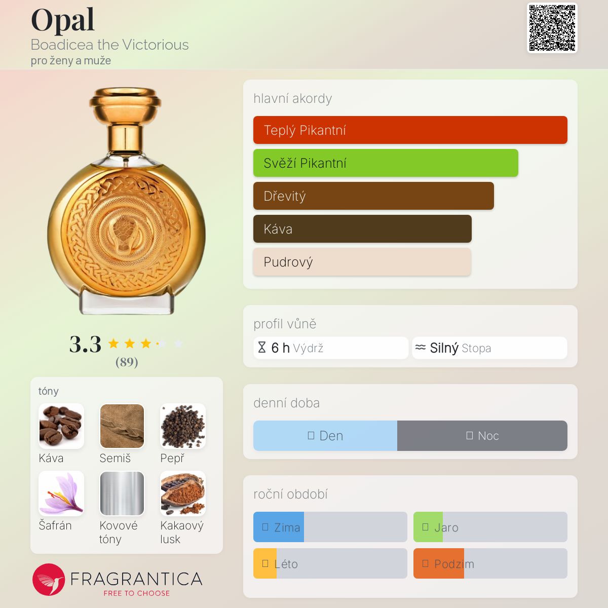 Opal podle Boadicea the Victorious je Orientální Floral vůně pro ženy a muže. Toto je nová vůně. Opal byl/a uveden/a v roce 2025. "Nosem" za touto vůní je Julie Lerendu. Vrchní tóny jsou Káva, Černý pepř, Šafrán, Kovové tóny, Bergamot, Bobkový list a Skořice; střední tóny jsouSemiš, Kakao, Orris, Šalvěj muškátová, Levandule, Davana, Pelargónie, Růže a Muškátový oříšek ; základní tóny jsou Santalové dřevo, Orris, Pačuli, Pižmo, Mech, Cedr, Fazole tonka, Kašmír a Dřevité tóny.