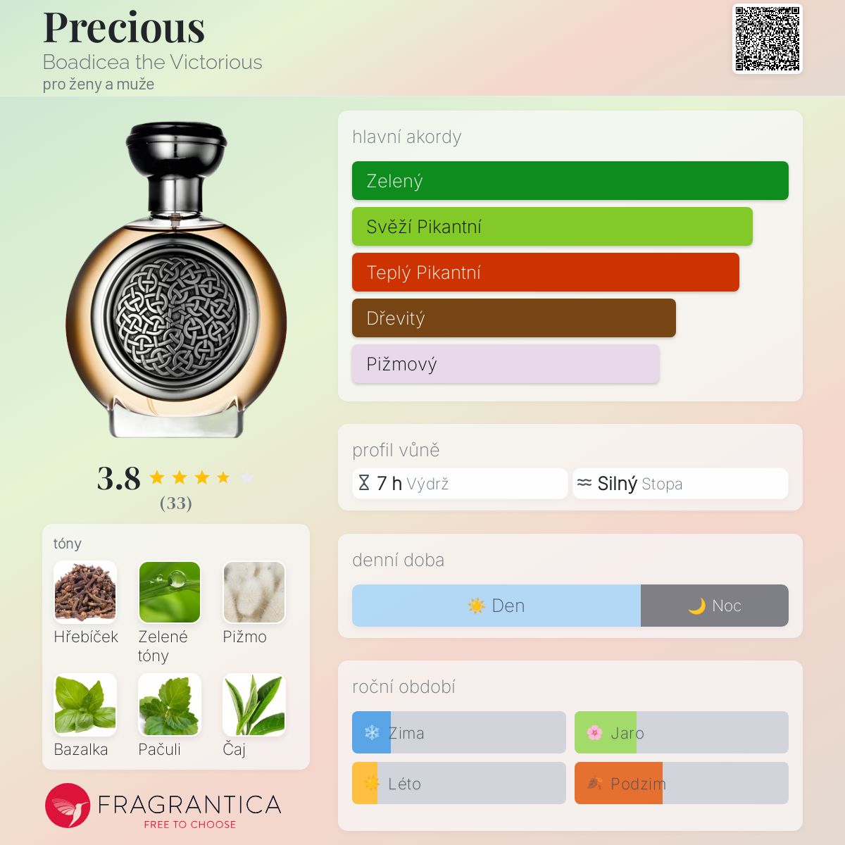 Precious podle Boadicea the Victorious je vůně pro ženy a muže. Vrchní tóny jsou Hřebíček, Bazalka, Černý čaj a Citrón; střední tóny jsouBylinné tóny, Muškátový oříšek, Jasmín a Květinové tóny ; základní tóny jsou Pižmo, Pačuli, Cedr, Jantar (ambra) a Santalové dřevo.
